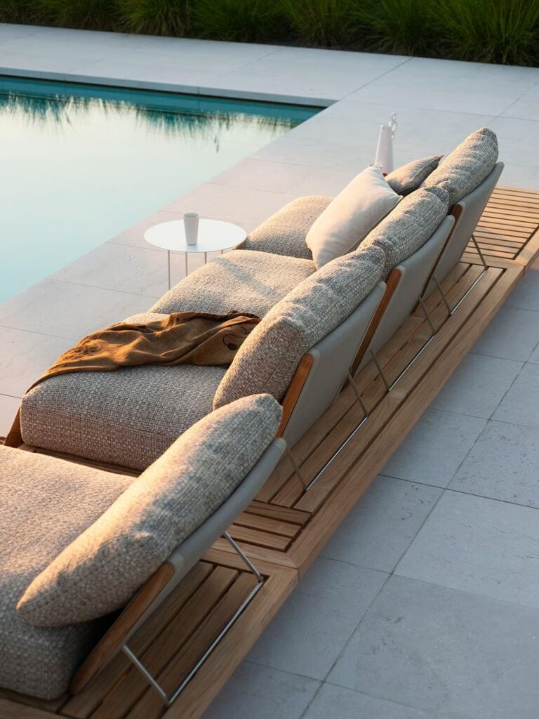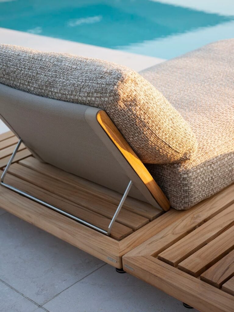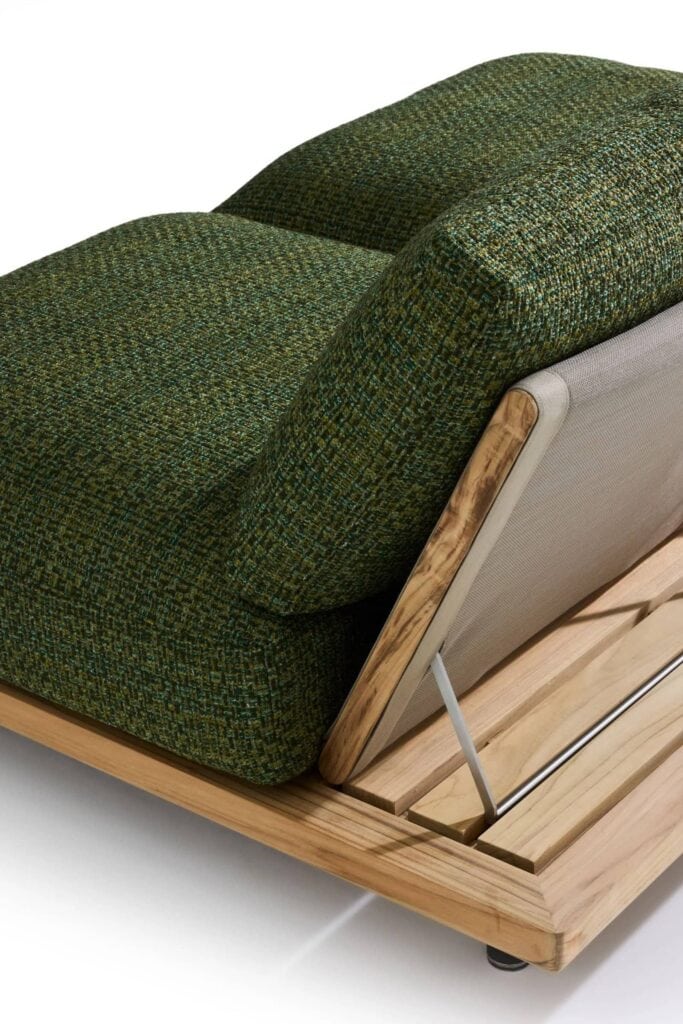 Die tragende Struktur ist das Carabottino, das heißt das Gitter aus Holz, das typischerweise im nautischen Bereich verwendet wird, die Seele dieses Möbelvorschlags für das Wohnen aus natürlichem Teakholz, das sich von Couchtischen über Sitze bis hin zu den Modulen des Outdoor-Sofas entwickelt und bis zu großzügigeren Abmessungen für die Doppelliege reicht.