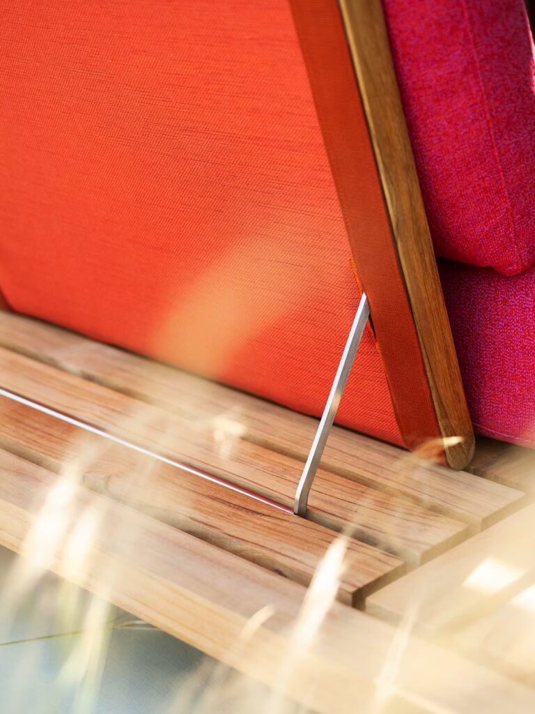 Die Verwendung von hochwertigen Materialien wie FSC®-zertifiziertem Teakholz (FSC-C155819), Batyline und Gurten, kombiniert mit der Vielseitigkeit und Größe der Module, macht Philia zu einem Zeugen der ursprünglichen Philosophie von RODA. Ein Möbelstück für das zeitgenössische Wohnen, das sich Momente des Komforts und der Geselligkeit in Gärten und auf Terrassen.