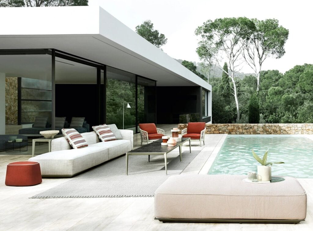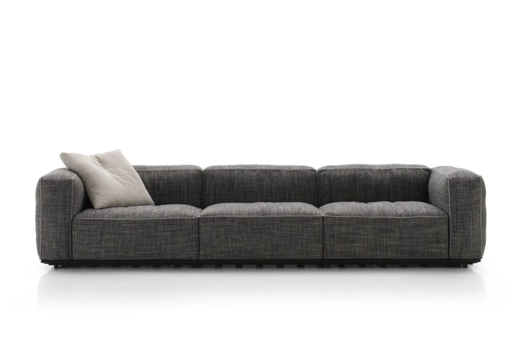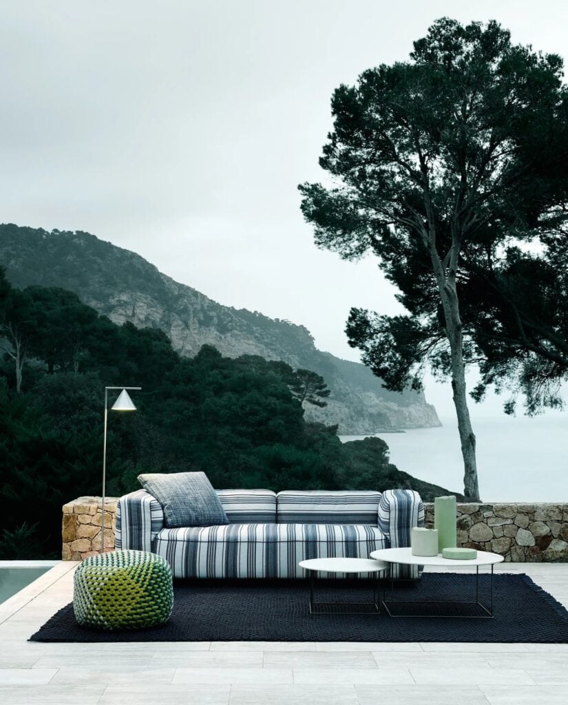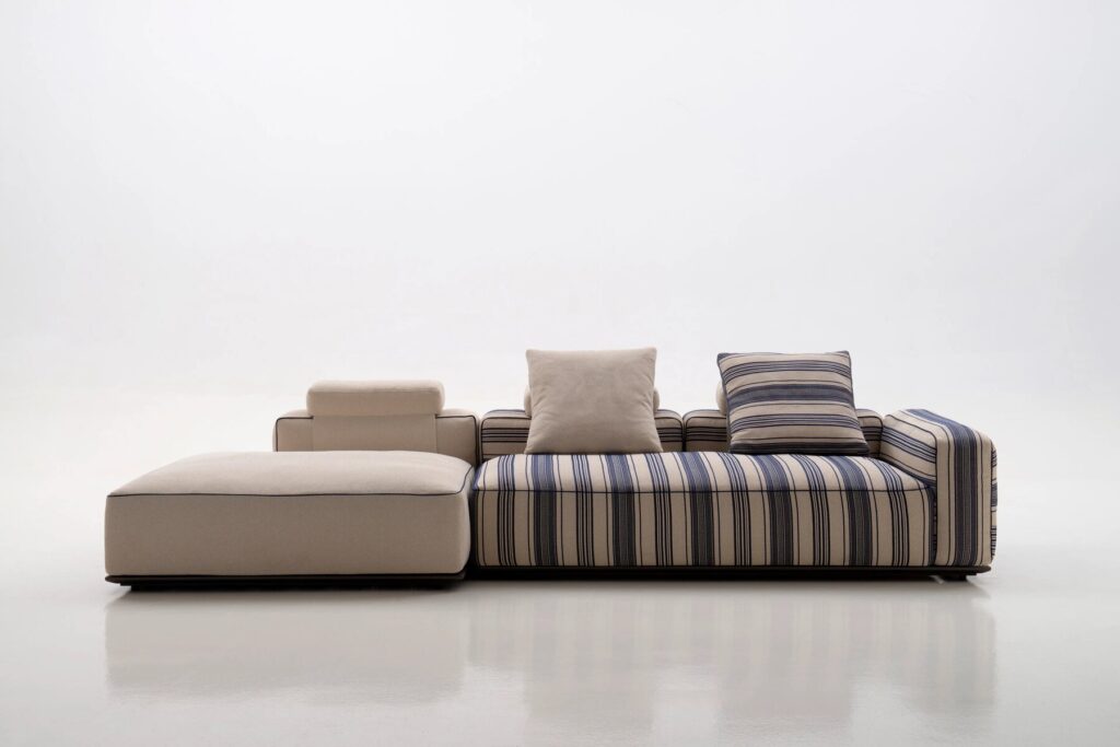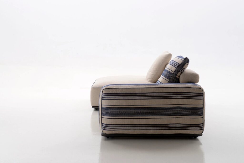 Antonio Citterio entwickelte und schuf Hybrid, ein innovatives neues System modularer Sitzelemente, das so vielseitig ist, dass es in einer fast unendlichen Anzahl von Kombinationen zusammengestellt werden kann. Die Schlüsselrolle der textilen Dimension fällt sofort ins Auge, mit Polstern, die die großzügige Polsterung, den absoluten Protagonisten, vollständig bedecken. Es handelt sich um typische Elemente der Inneneinrichtung, die mit Hybrid eine Interpretation für den Außenbereich finden. Daher auch der Name der Kollektion, die als echte Verbindung zwischen dem Innen- und dem Außenbereich des Hauses vorgeschlagen wird. Hybrid ist in der Tat das perfekte Einrichtungselement für Räume, die sich durch eine kontinuierliche Verschmelzung von Innen und Außen auszeichnen, für Räume, die sich zum Freien hin öffnen, und für Wohnräume, die in Terrassen und Gärten integriert sind. Die Kombination von Gegensätzen geschieht nicht nur visuell, sondern auch über den Tastsinn. Hybrid garantiert den typischen Komfort traditioneller Polstermöbel für Innenräume dank einer neuartigen Sitzmatratze, die für die Einrichtung von Außenbereichen konzipiert wurde. Die Kissen bestehen aus unterschiedlich dichten Polstern, die so konzipiert sind, dass sie sich angenehm an den Körper anschmiegen und ihn gleichzeitig stützen, ohne dabei einzusinken. Die tragenden Strukturen sind fast unsichtbar, und der Sitz scheint einige Zentimeter über dem Boden zu schweben. Das solide Gestell besteht aus einem Rahmen aus stranggepresstem Aluminium, der in den Farben Salbei, Ton und Anthrazit lackiert ist, und wird durch eine Plattform mit Glasfaserlamellen ergänzt. Hinter der Rückenlehne verbirgt sich eine mit weichem Polyurethan überzogene Aluminiumstruktur, die wiederum mit einer gepolsterten Hülle bedeckt ist, die mit einem Bezug aus wasserdichtem Stoff ergänzt wird. Die Plattform ist in acht Größen und zwei Tiefen erhältlich, während die Armlehne und die Rückenlehne in zwei Höhen erhältlich sind. Um den Komfort des tieferen Sitzes zu erhöhen, kann die niedrige Rückenlehne mit einem zusätzlichen Kopfteilkissen erhöht werden. Die Hybrid-Kollektion umfasst auch eine Reihe neuer Outdoor-Stoffe aus Polypropylen-Melange-Garn in fünf Farbvarianten, die durch raffinierte Besätze akzentuiert werden. Eine Auswahl, die sowohl im Innen- als auch im Außenbereich eine entschiedene und elegante Präsenz zeigt.