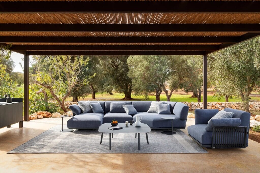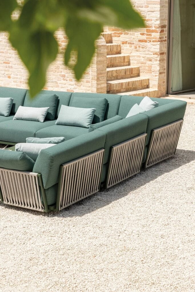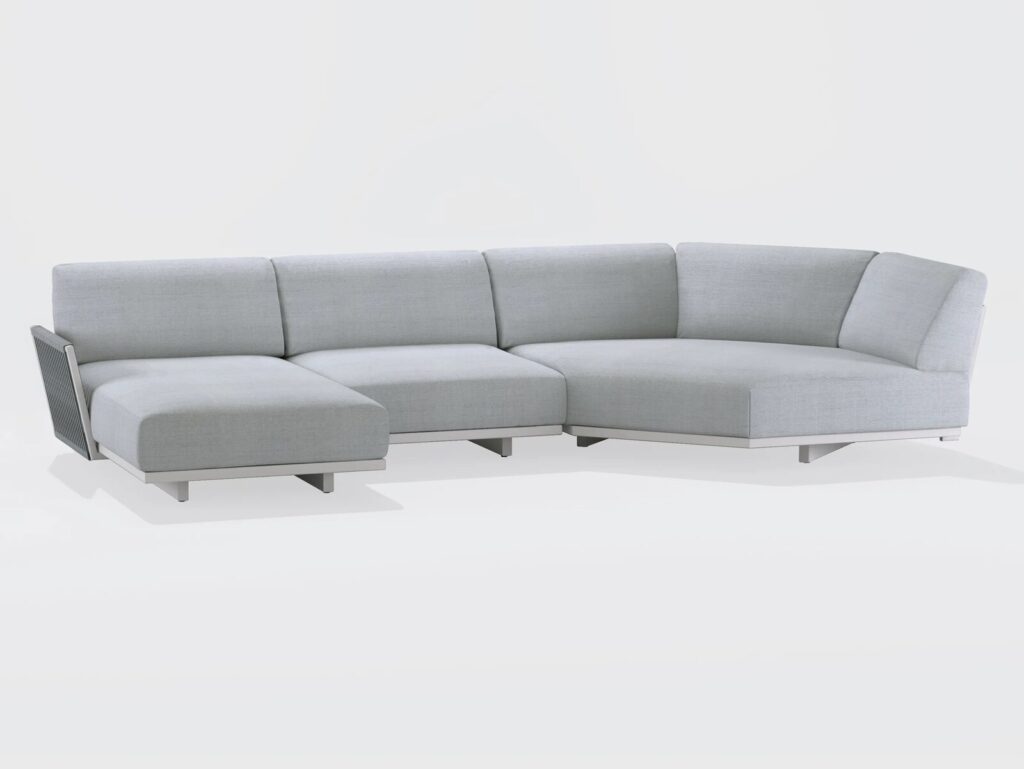 Solaris ist eine Einladung zum Entspannen und zur Kontemplation im Freien. Solaris ist ein echtes Outdoor-Sitzmöbel, das sich durch seine grosszügigen Formen und seine extreme Modularität auszeichnet und sowohl im Wohn- als auch im Objektbereich eingesetzt werden kann. Die Geradlinigkeit des Gestells aus stranggepresstem Aluminium, das in allen Fast-Farben erhältlich ist, wird durch die grosszügigen, leicht abgerundeten Kissen gemildert, und die Proportionen zwischen dem oberen und dem unteren Teil sorgen für einen überraschenden Schwebeeffekt. Die speziell für den Aussenbereich konzipierten Kissen haben abnehmbare Bezüge und sind sowohl in der Standard- als auch in der wasserdichten Version erhältlich. Die Basisversion von Solaris kann mit einem flachen Seilgeflecht verziert werden, das in 6 Farben erhältlich ist und zu allen Fast-Ausführungen und Stoffen passt.