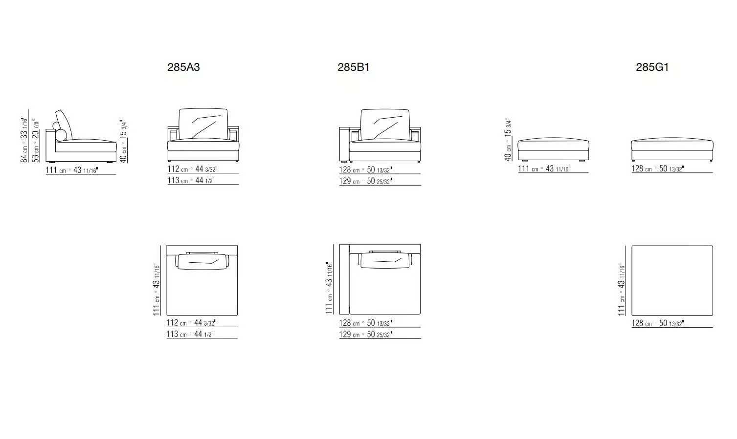 Die streng schlichte Form des mit Epoxidpulver in einer raffinierten Farbpalette beschichteten Aluminiumgestells wird durch große Sitz- und Rückenkissen, ebenfalls in quadratischer Form, ergänzt, die aber großzügig gepolstert und mit einem eleganten Gros Grain Umrandungsprofil versehen sind.