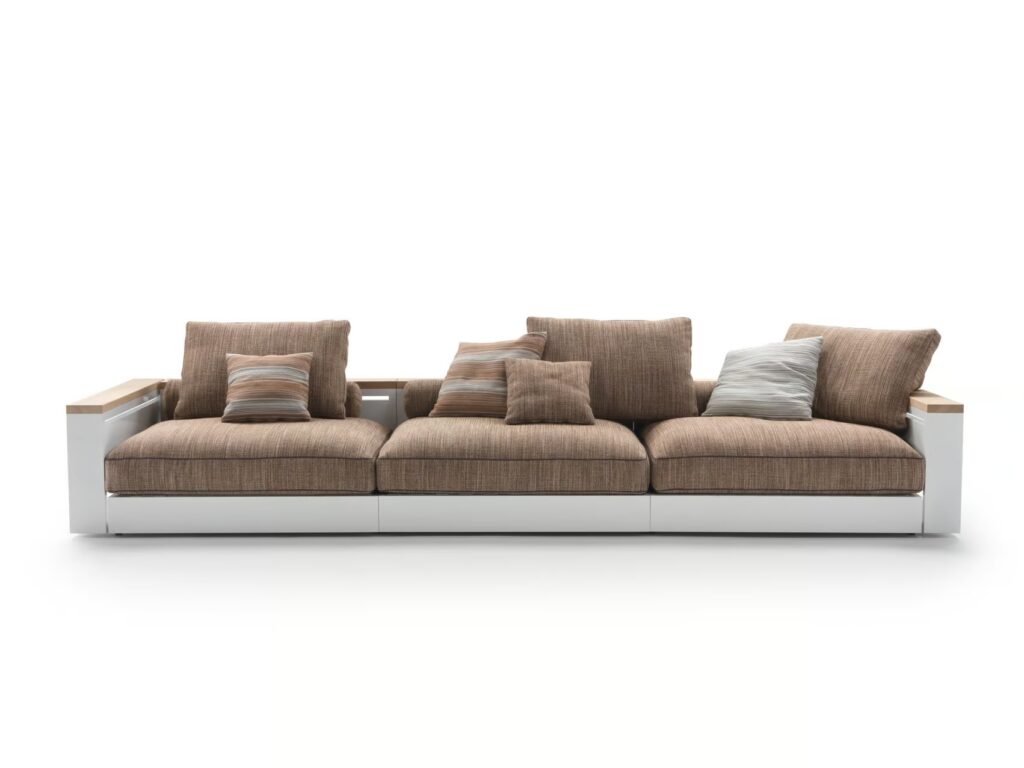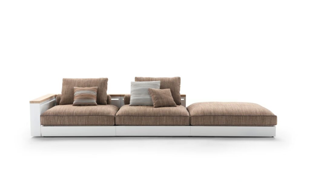 Zum Sitzprogramm Freeport gehört auch eine verstellbare Liege, die allein verwendet oder mit leicht anbring- und abnehmbaren Verbindungsstücken in unterschiedlich zusammengesetzte Kompositionen integriert werden kann. Um die Konfigurationen noch funktioneller zu gestalten, ist es möglich, Elemente mit Oberflächen aus Naturstein als Ablagen einzufügen.