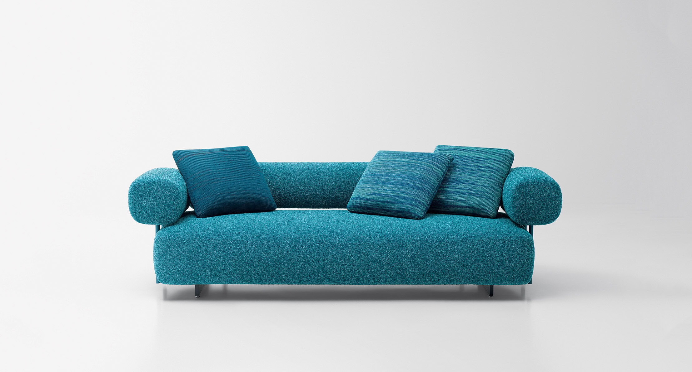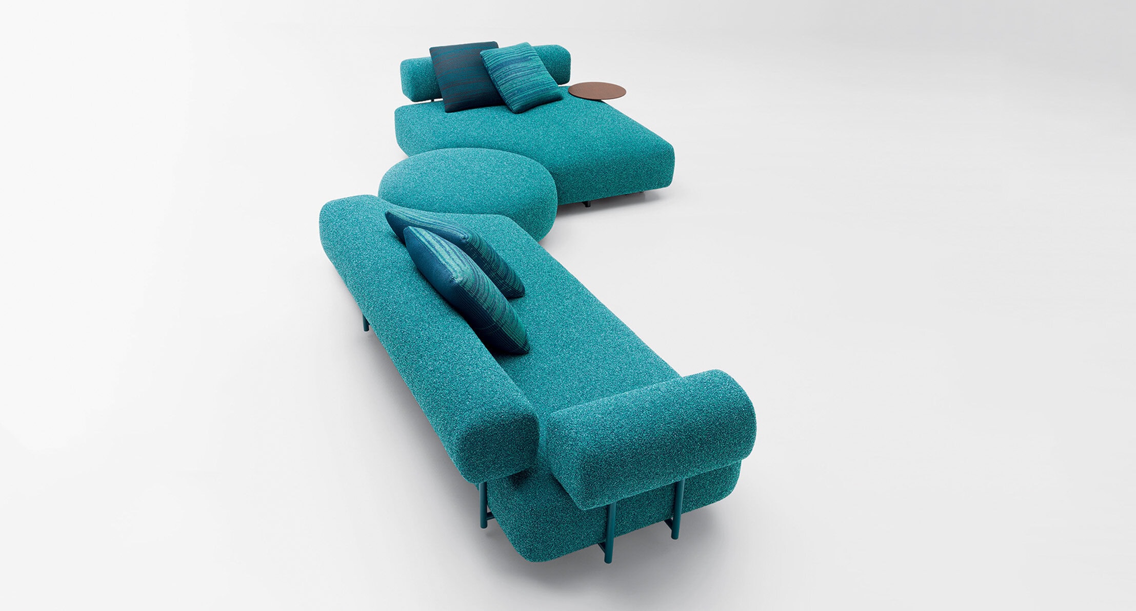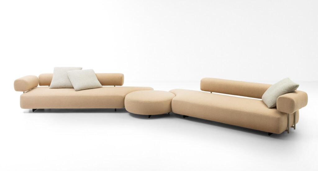 SANTORINI ist eine Serie, die aus zwei- oder dreisitzigen, modularen Elementen, einer geformten Plattform und einem Hocker besteht.