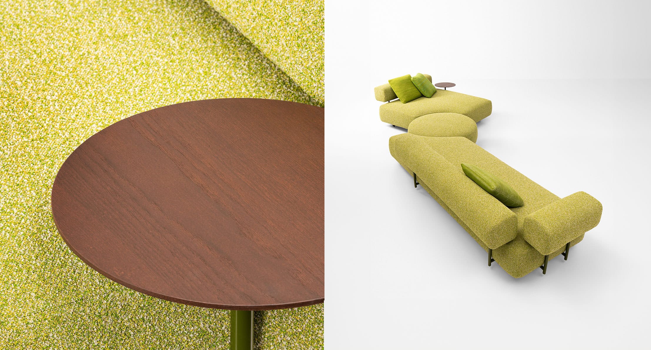 Die Elemente können in Kombination mit dem Pouf zu gelenkigen Kompositionen mit unterschiedlichen Winkelamplituden verwendet werden und sind leicht veränderbar.