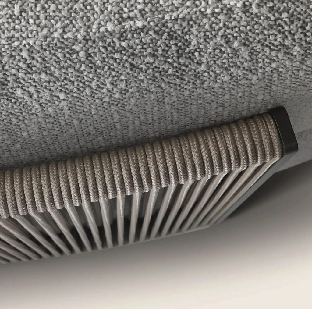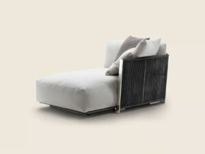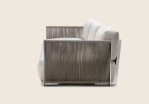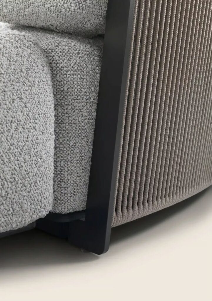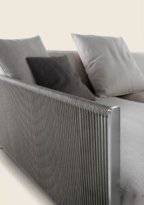 The base of the sofa is made of marine plywood, while the armrests and backrest structure are crafted from 316 austenitic stainless steel, a superalloy that guarantees excellent outdoor performance. These elements are covered in a sophisticated weave made of polypropylene fiber or polyurethane rubber, available in a refined color palette.