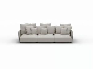 The sofa rests on a perimeter frame made of 316 austenitic steel and nylon feet.
