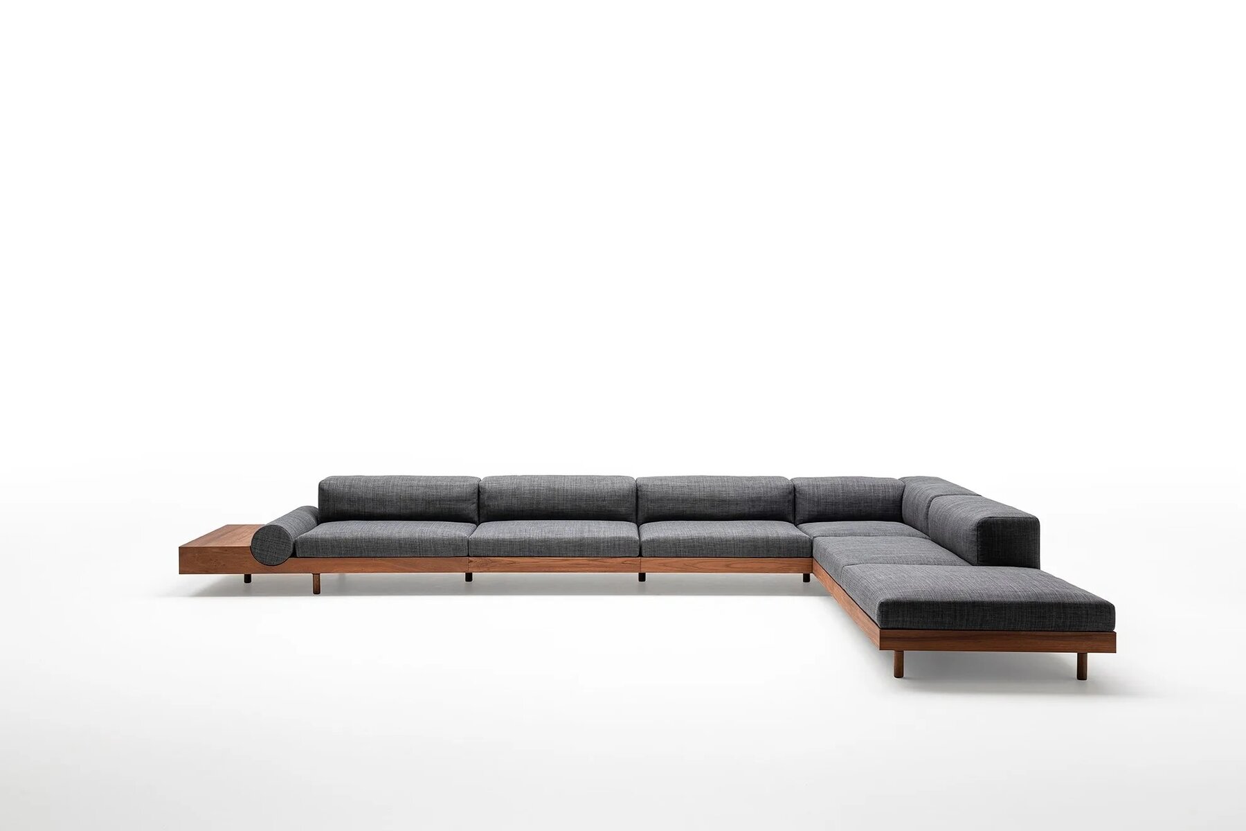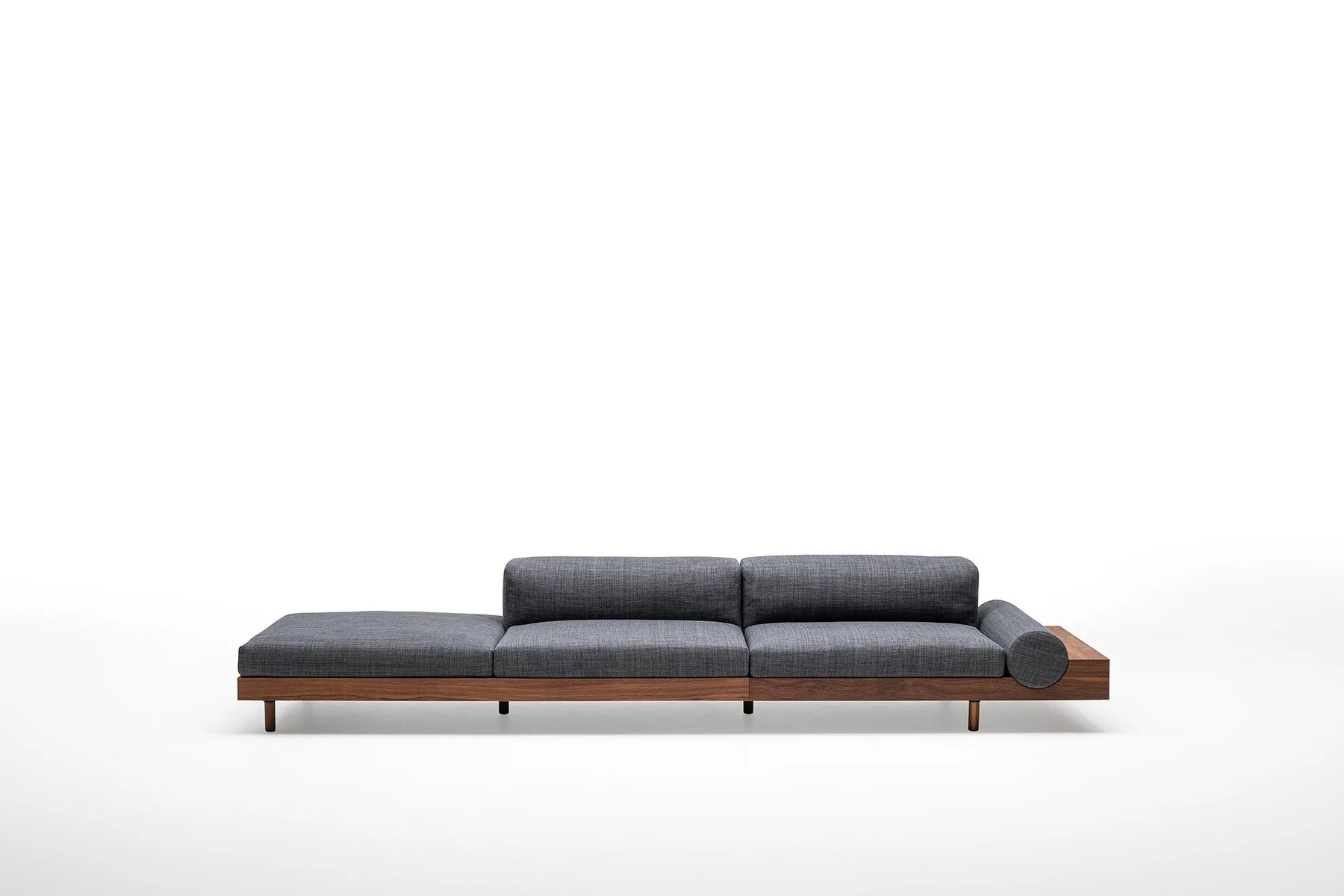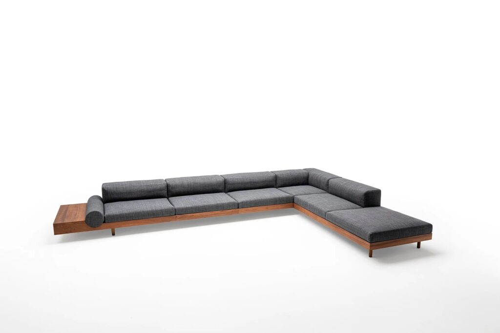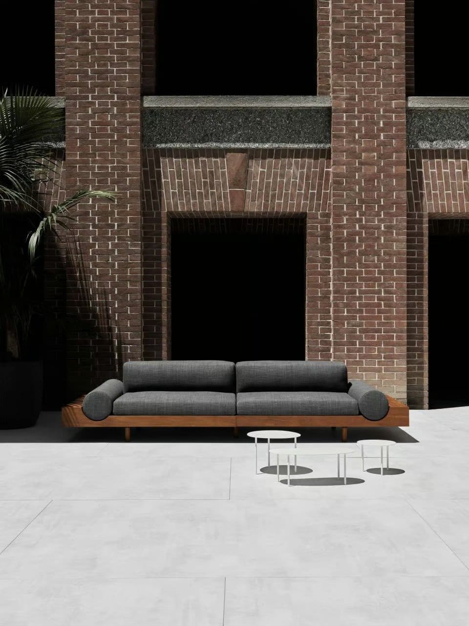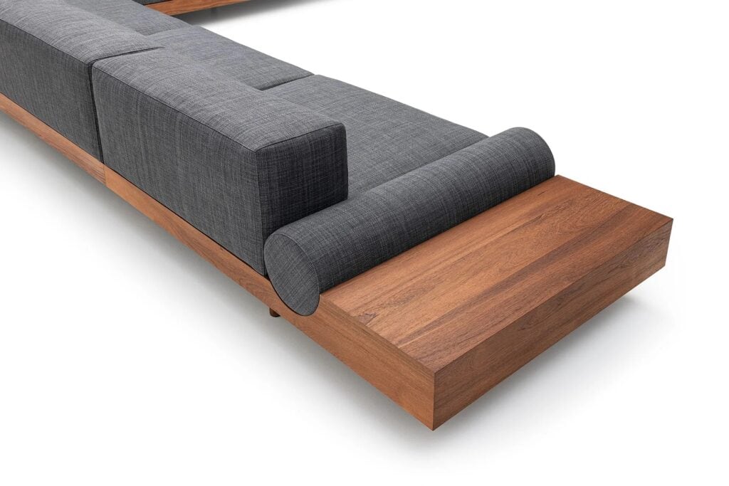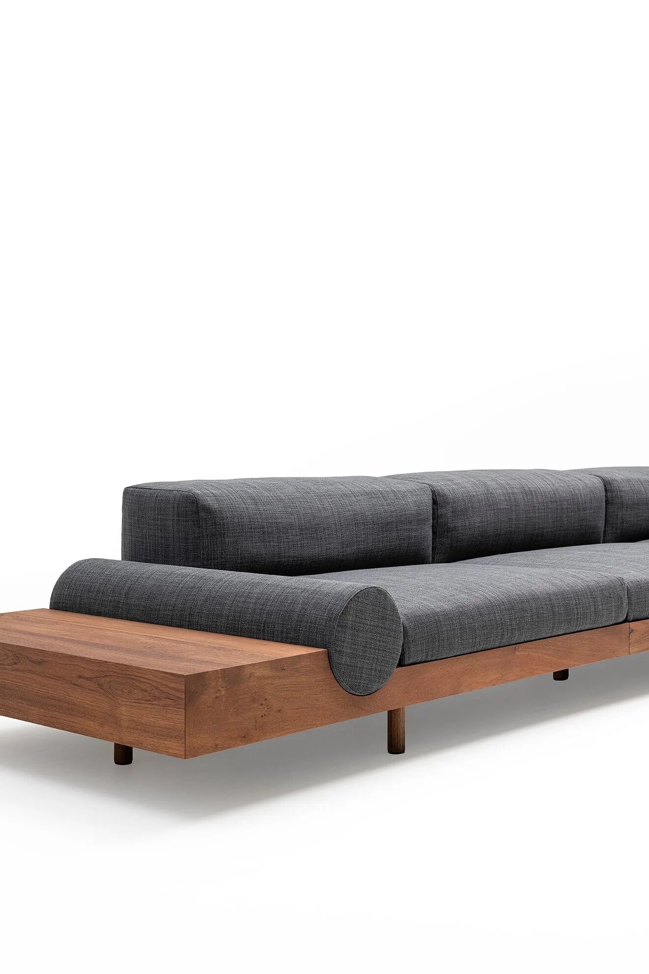 Modulare Elemente unterschiedlicher Grösse, bestehend aus einer tragenden Struktur aus massivem Teakholz 90x35mm, mit einem UV-schützenden und wasserabweisenden Ölfinish und einer Sitzplatte aus schwarz gefrästem 8mm HPL, die in die Tragstruktur eingesetzt ist und von eckigen und zentralen Gestellen bedruckten aus recyceltem und regeneriertem Polyamid getragen wird, die mit Edelstahlschrauben daran befestigt sind. Rückenlehnenstruktur aus Sperrholz für den Aussenbereich und massivem Tannenholz mit offenzelliger TCL-Polyurethanschaumpolsterung unterschiedlicher Dichte, bedeckt mit recycelter Microflock Matratze für den Aussenbereich und Bezug aus wasserabweisendem Stoff, mit gedruckten Details an der Sitzplatte angeschraubt; Sitzkissen aus offenzelligem TCL-Polyurethanschaum unterschiedlicher Dichte, bedeckt mit einer Matratze aus recyceltem Microflock für den Aussenbereich und Bezug aus wasserabweisendem Stoff, Rollenarmlehne aus offenzelligem TCL-Polyurethanschaum mit Bezug aus wasserabweisendem Stoff. Füsse aus massivem Teakholz Ø40mm, an den eckigen Gestellen durch eine darin eingebettete Buchse befestigt, und Bodenstütze durch Füsse aus schwarzem Polyurethan, die für den Aussenbereich geeignet sind. Stoffbezug für den Aussenbereich, vollständig abnehmbarer mit Reiss- und Klettverschlüssen. Die verschiedenen Elemente können über eine zentrale Halterung miteinander kombiniert werden, die auch für die Montage der Füsse in massivem Teakholz geeignet ist. Sitztiefe 65 cm.