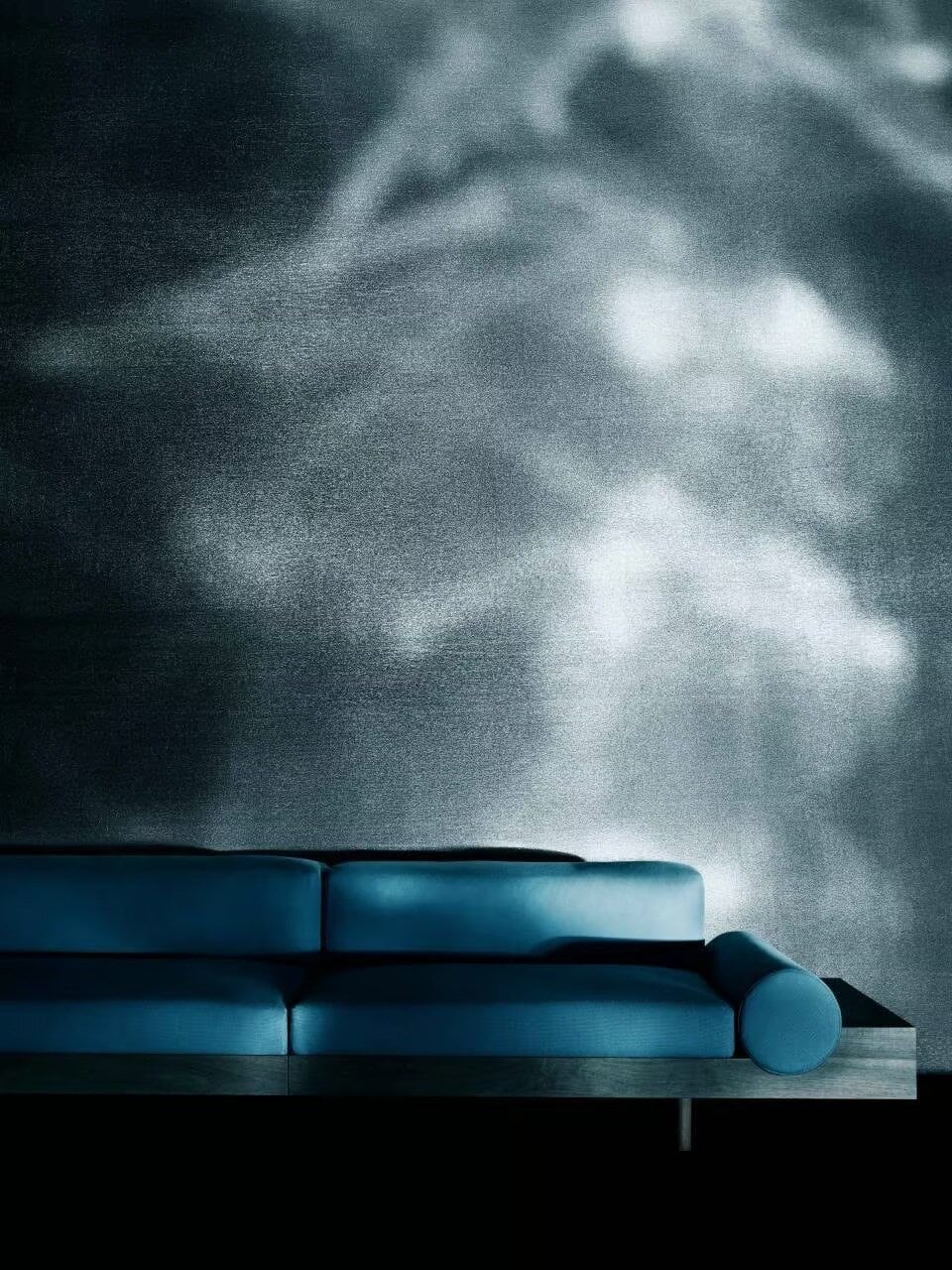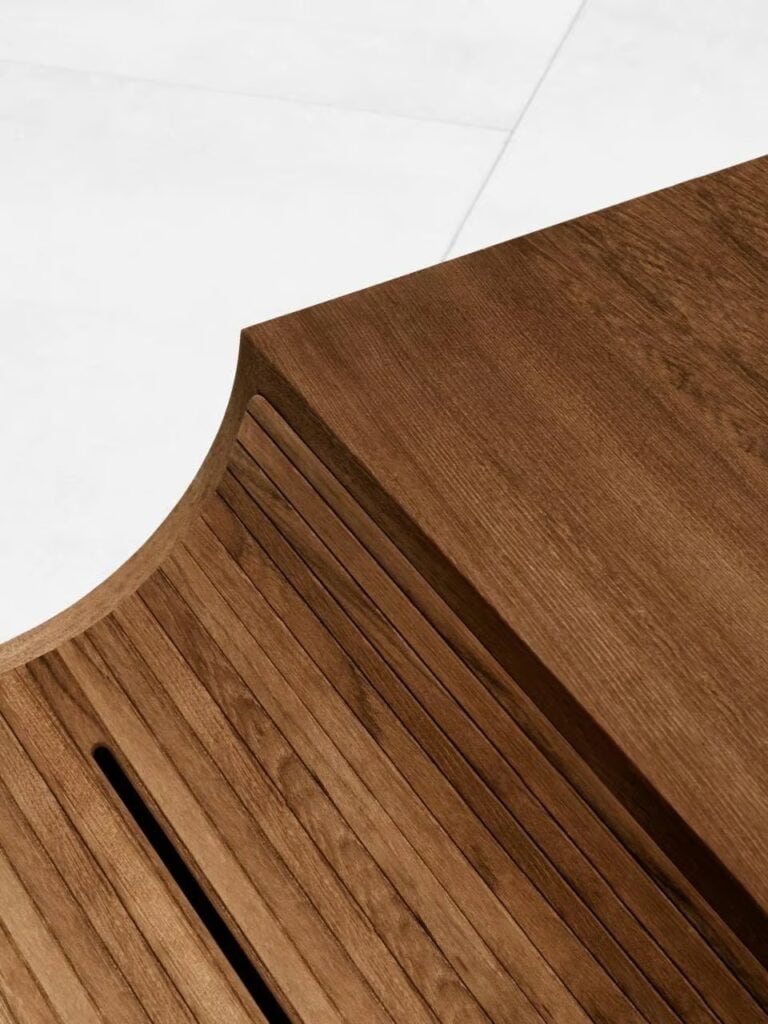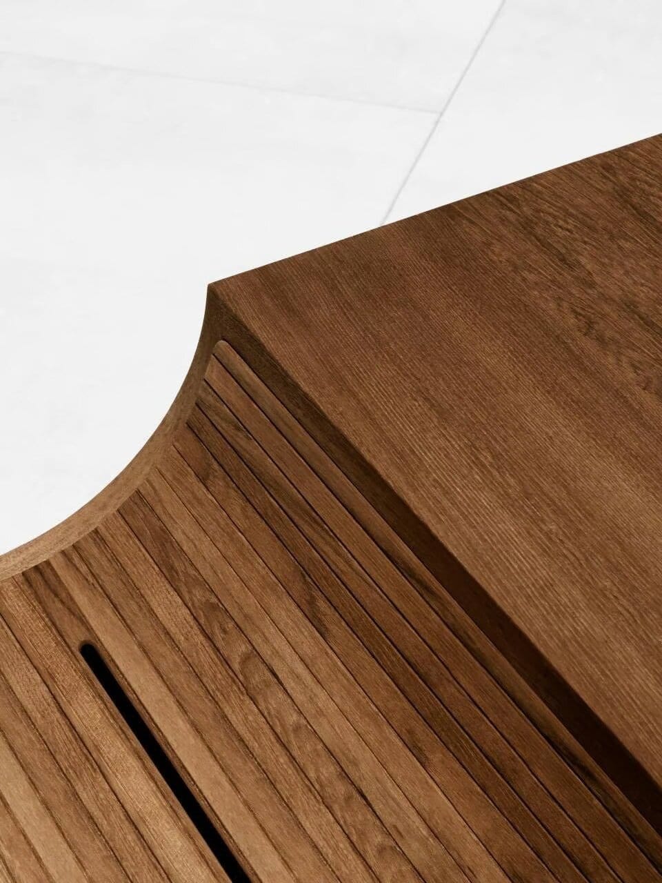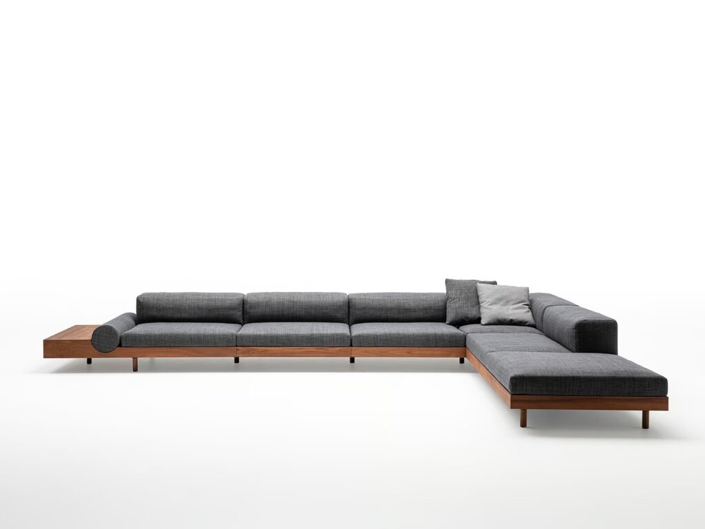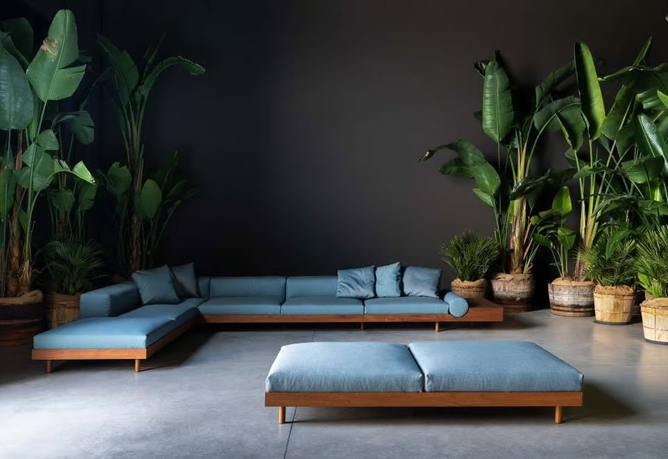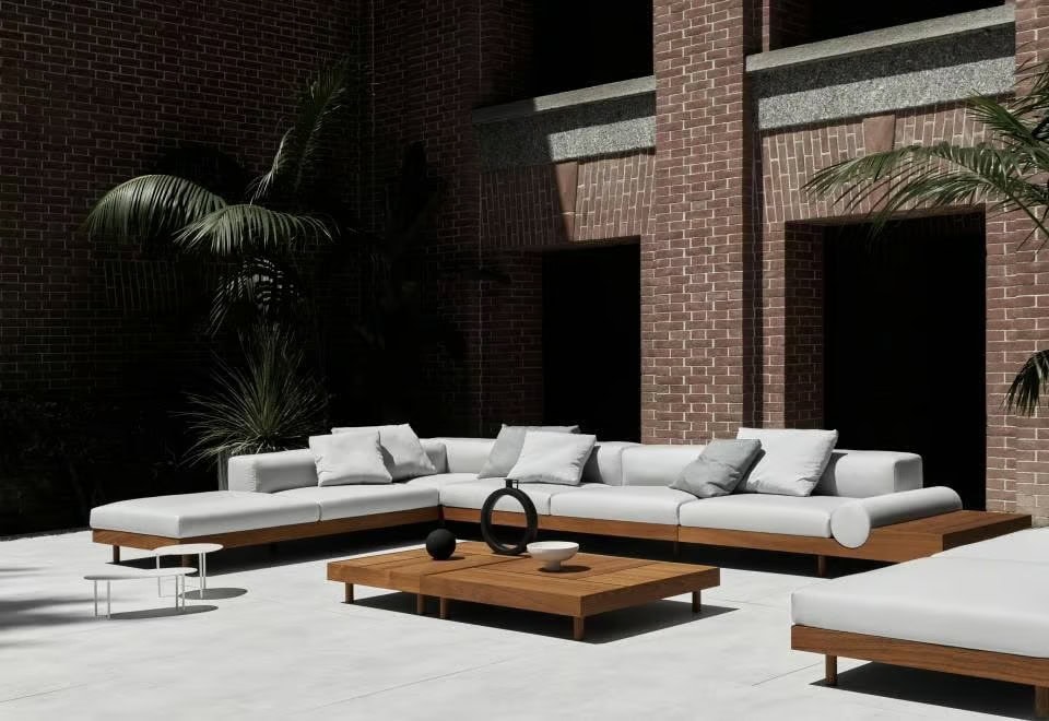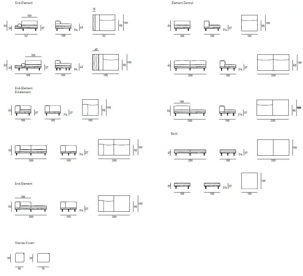 Modulare Elemente unterschiedlicher Grösse, bestehend aus einer tragenden Struktur aus massivem Teakholz 90x35mm, mit einem UV-schützenden und wasserabweisenden Ölfinish und einer Sitzplatte aus schwarz gefrästem 8mm HPL, die in die Tragstruktur eingesetzt ist und von eckigen und zentralen Gestellen bedruckten aus recyceltem und regeneriertem Polyamid getragen wird, die mit Edelstahlschrauben daran befestigt sind. Rückenlehnenstruktur aus Sperrholz für den Aussenbereich und massivem Tannenholz mit offenzelliger TCL-Polyurethanschaumpolsterung unterschiedlicher Dichte, bedeckt mit recycelter Microflock Matratze für den Aussenbereich und Bezug aus wasserabweisendem Stoff, mit gedruckten Details an der Sitzplatte angeschraubt; Sitzkissen aus offenzelligem TCL-Polyurethanschaum unterschiedlicher Dichte, bedeckt mit einer Matratze aus recyceltem Microflock für den Aussenbereich und Bezug aus wasserabweisendem Stoff, Rollenarmlehne aus offenzelligem TCL-Polyurethanschaum mit Bezug aus wasserabweisendem Stoff. Füsse aus massivem Teakholz Ø40mm, an den eckigen Gestellen durch eine darin eingebettete Buchse befestigt, und Bodenstütze durch Füsse aus schwarzem Polyurethan, die für den Aussenbereich geeignet sind. Stoffbezug für den Aussenbereich, vollständig abnehmbarer mit Reiss- und Klettverschlüssen. Die verschiedenen Elemente können über eine zentrale Halterung miteinander kombiniert werden, die auch für die Montage der Füsse in massivem Teakholz geeignet ist. Sitztiefe 65 cm.