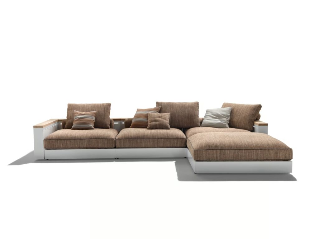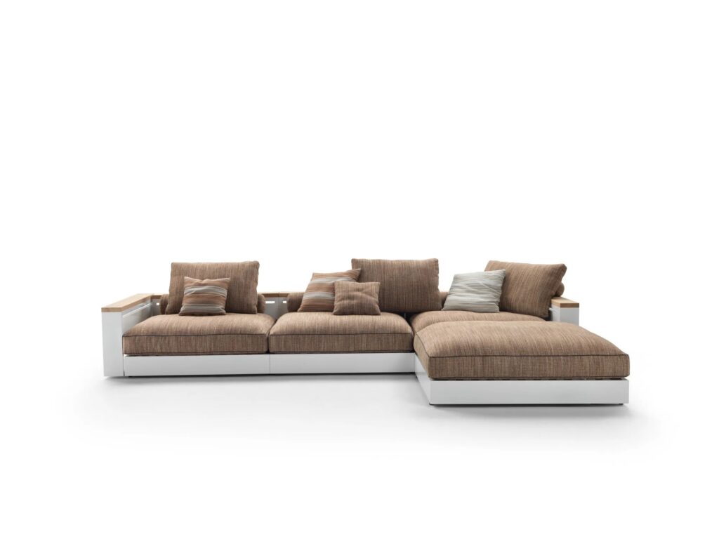 Zum Sitzprogramm Freeport gehört auch eine verstellbare Liege, die allein verwendet oder mit leicht anbring- und abnehmbaren Verbindungsstücken in unterschiedlich zusammengesetzte Kompositionen integriert werden kann. Um die Konfigurationen noch funktioneller zu gestalten, ist es möglich, Elemente mit Oberflächen aus Naturstein als Ablagen einzufügen.