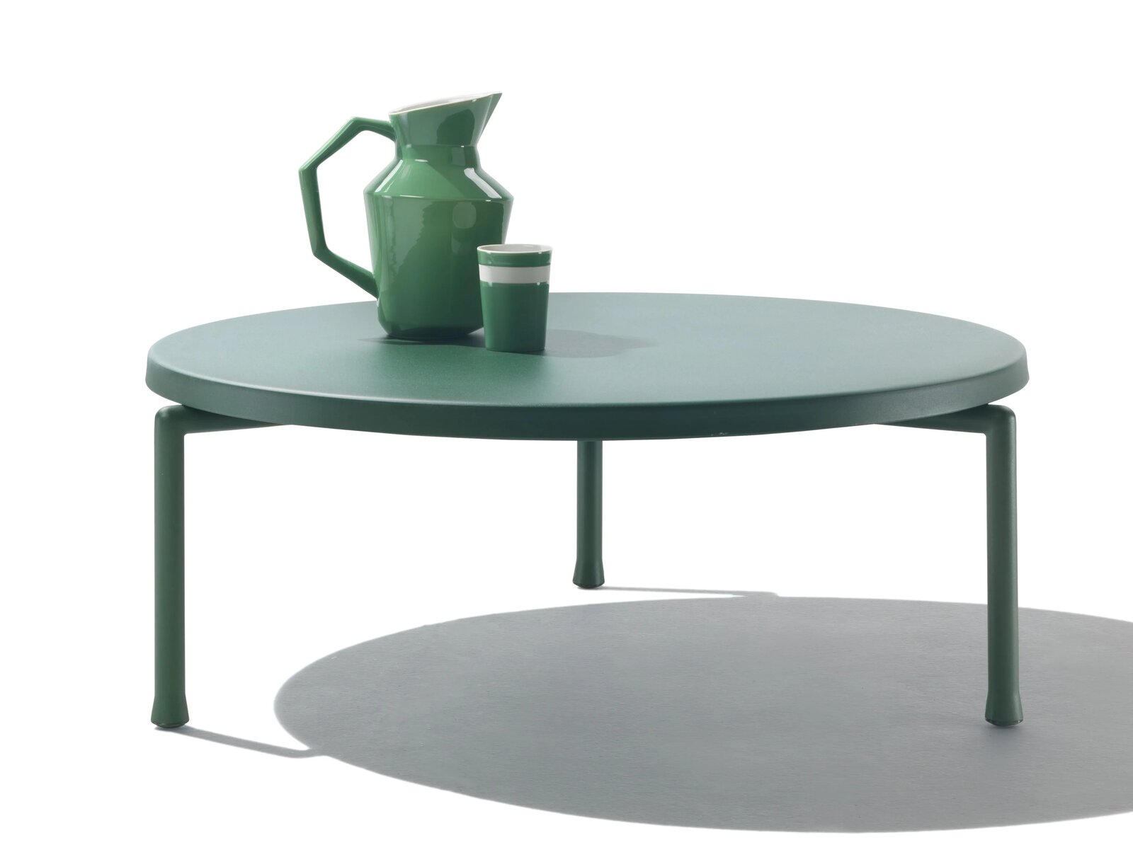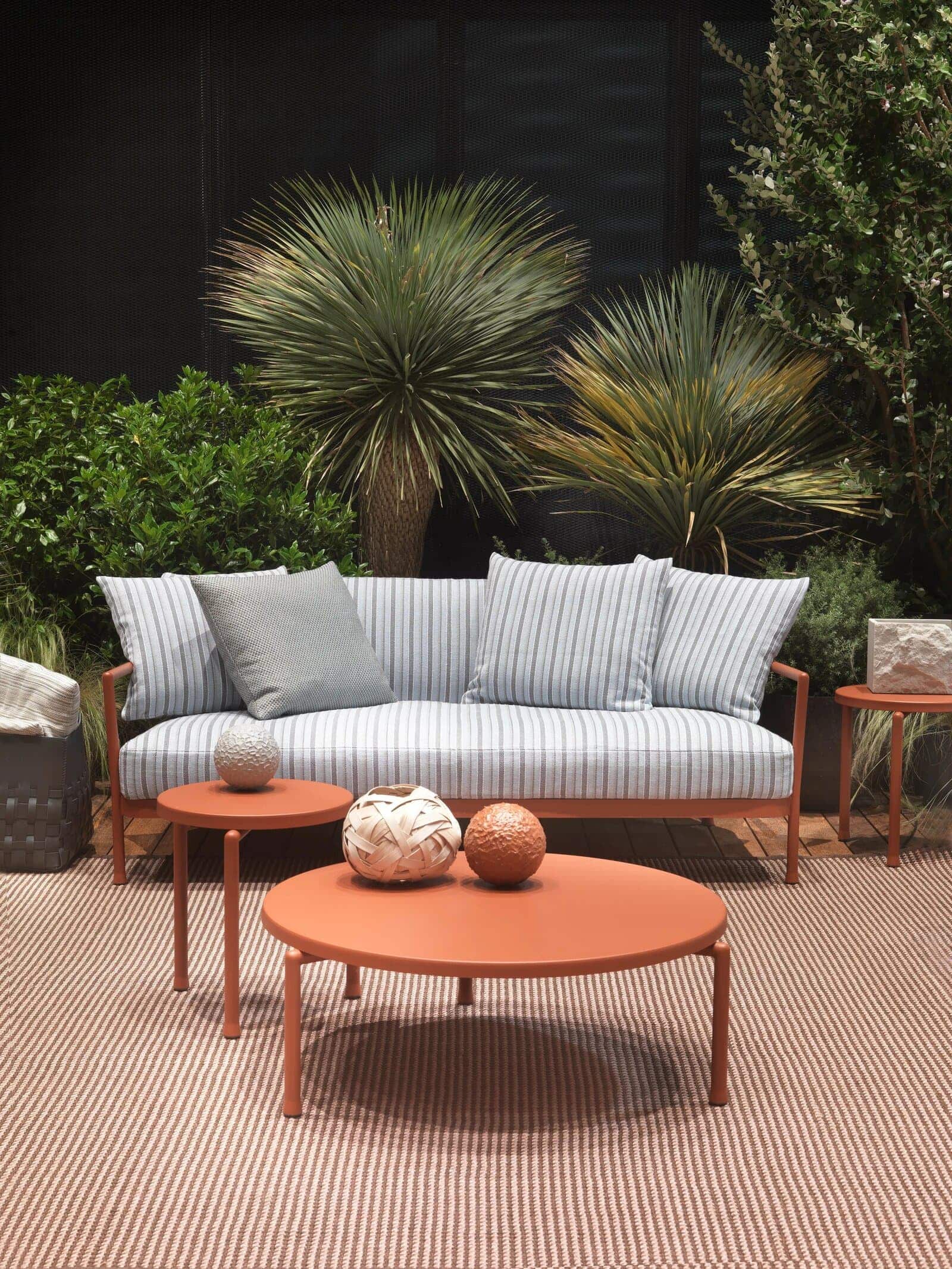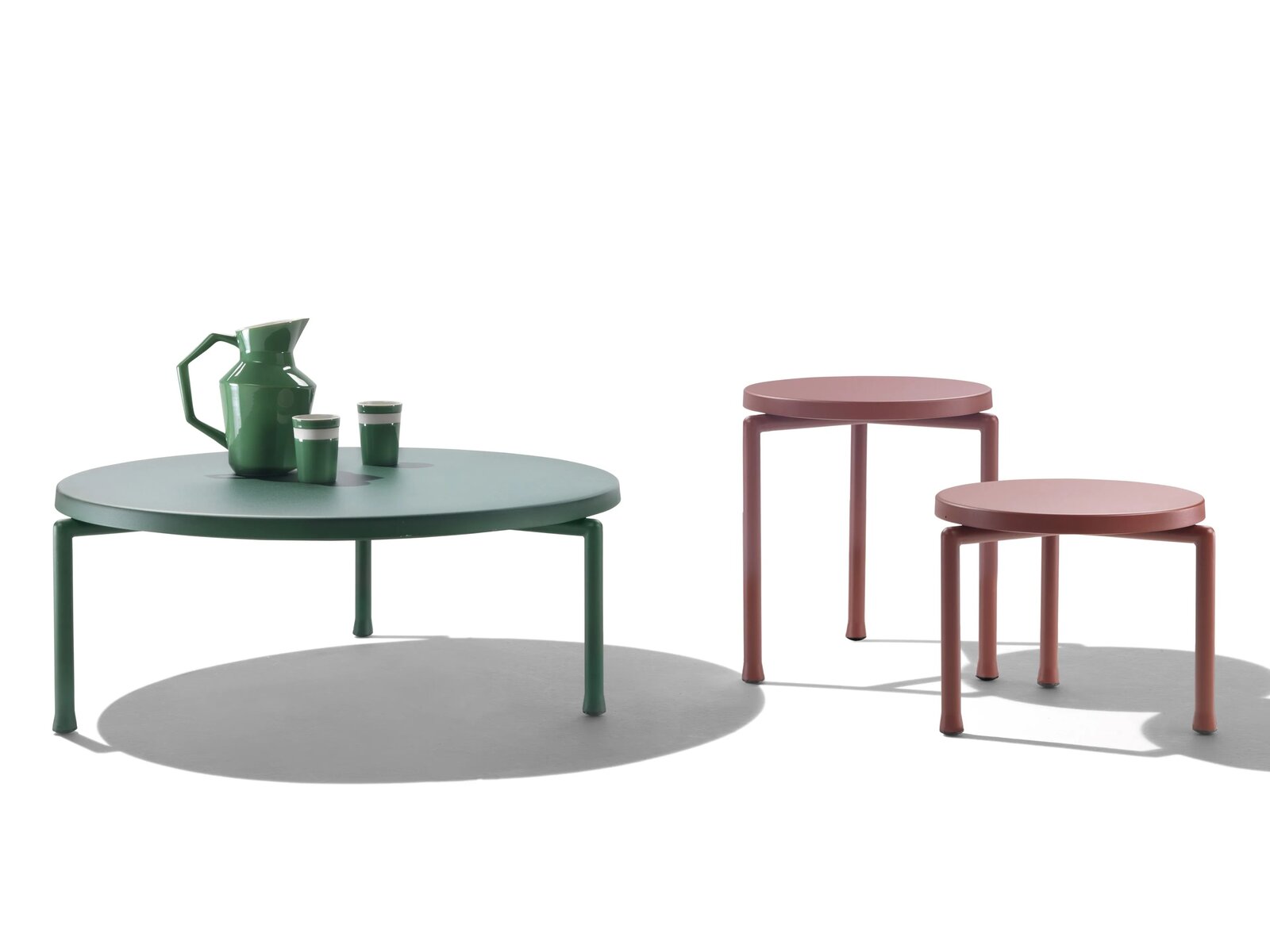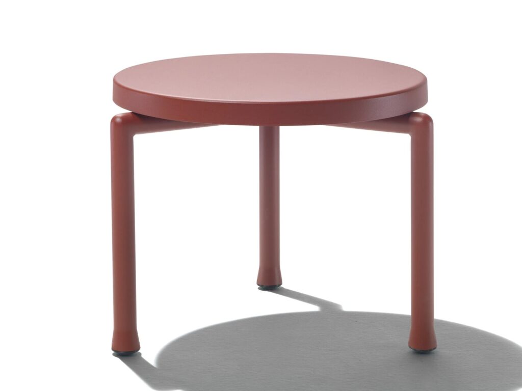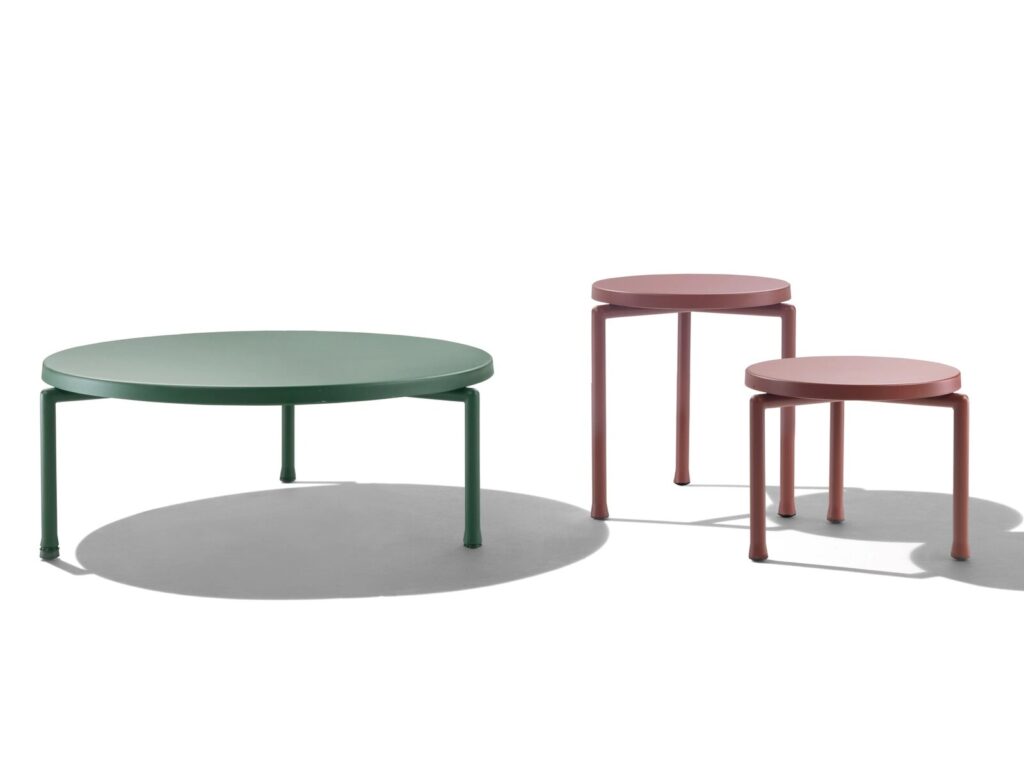 Trotz ihres offensichtlich minimalistischen Designs zeichnen sich die Beistelltische Alcamo durch ihre starke Persönlichkeit aus, die durch die leuchtenden Farben unterstrichen wird. Das Projekt der Beistelltische Alcamo steht ganz im Zeichen der Zweckmäßigkeit: Sowohl das dreibeinige Gestell als auch die Tischplatte bestehen aus Aluminium mit Pulverbeschichtung. Sie sind daher besonders leicht und können deshalb ganz einfach umgestellt werden. Außerdem müssen sie nicht abgedeckt werden, auch wenn zur Verwendung der speziellen Schutzhüllen geraten wird, damit sich die Möbel langfristig ihr ursprüngliches Aussehen bewahren. Die Beistelltische Alcamo sind in verschiedenen Abmessungen und Höhen erhältlich und der perfekte Farbtupfer für die unterschiedlichsten Einrichtungen, vom Balkon in der Stadt bis zum Garten eines Landhauses oder dem Poolbereich. Alle Teile, aus denen die Beistelltische Alcamo gefertigt werden, sind recycelbar.