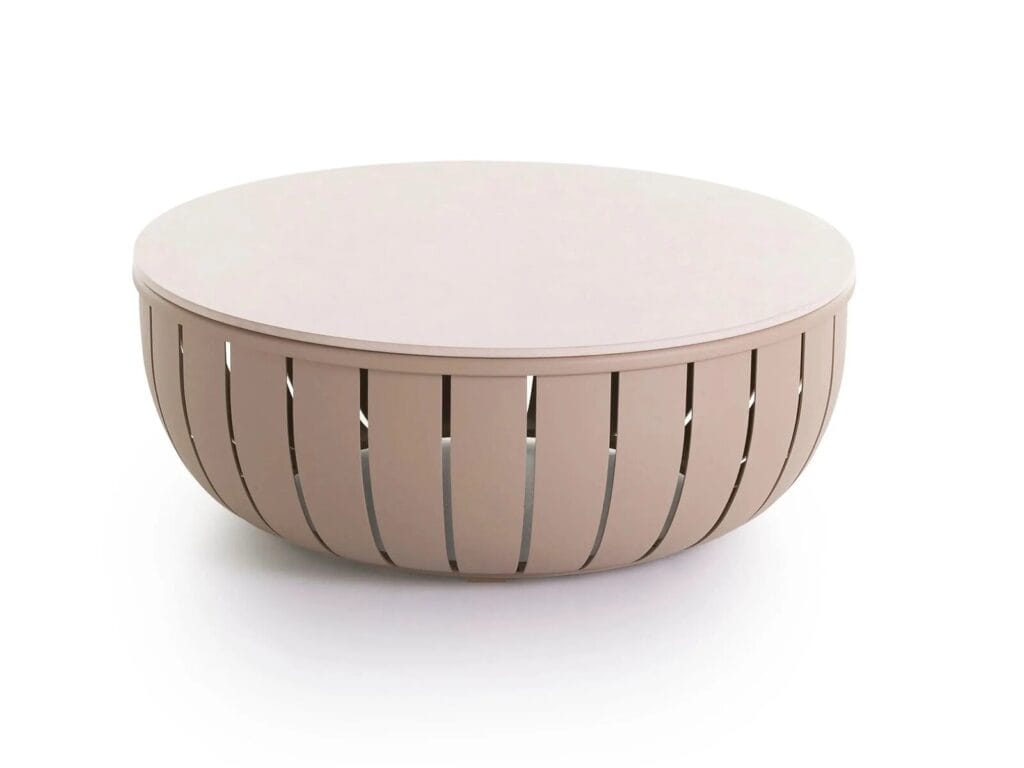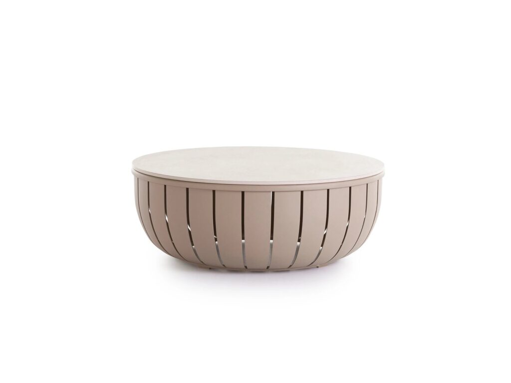 Der ARENA Couchtisch D90 ist ein Designertisch, dessen attraktive Struktur aus einzeln gebogenen, thermolackierten Aluminiumlamellen besteht und eine Platte aus einem speziellen Porzellanmaterial für den Aussenbereich aufweist