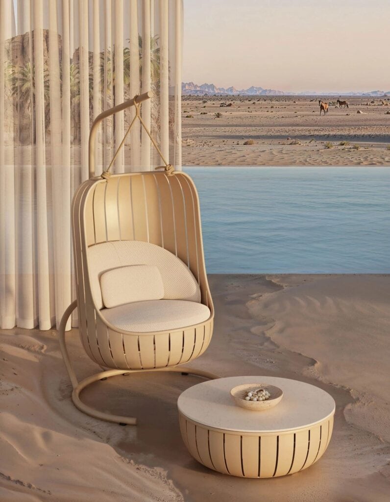Einerseits erinnern die Elemente und Typen mit ihren robusten, abgerundeten Formen und bearbeiteten Kanten an traditionelle Korbmöbel und Korbgeflechte. Andererseits erinnern die breiten, geschwungenen Lamellen an die für das skandinavische Design typischen Holzfurniere.