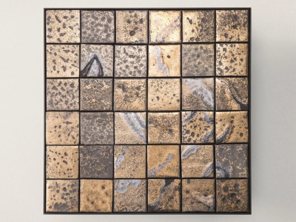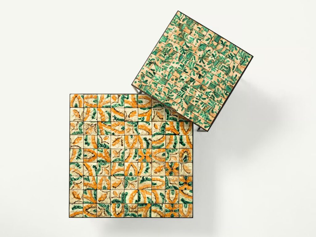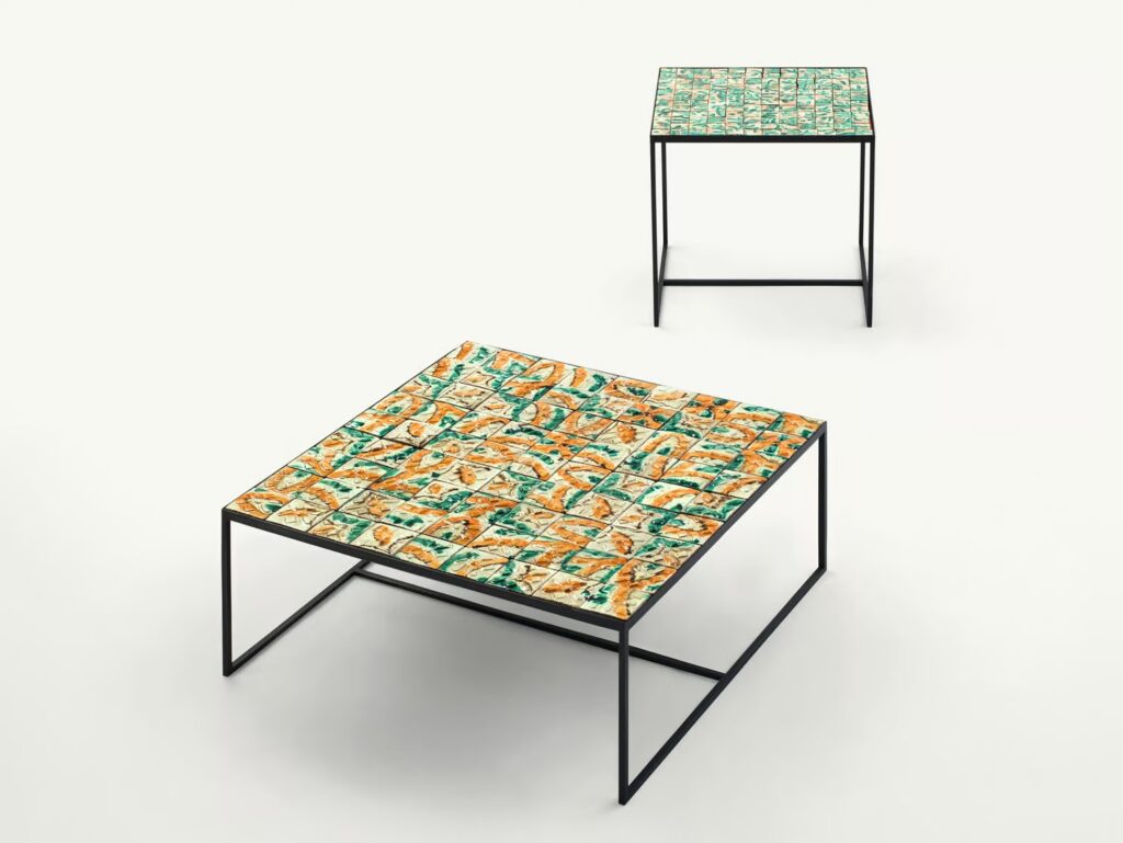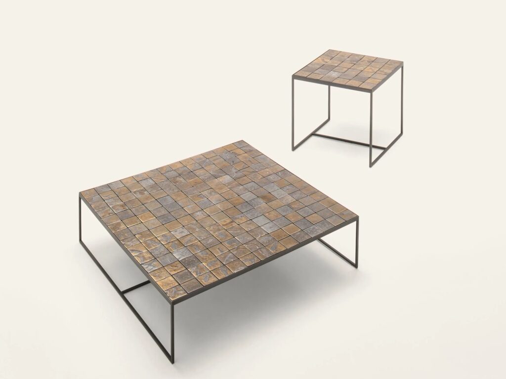 Die Platte des 63×63 cm großen Beistelltisches kann mit 7×7 cm großen Elementen (B105B) oder mit einem einzigen Element hergestellt werden.nDie Materialien, die besondere Handarbeit und die Produktionstechniken, die für die Platten verwendet werden, führen zu Farb- und Designunterschieden selbst bei ein und demselben Los von Platten.