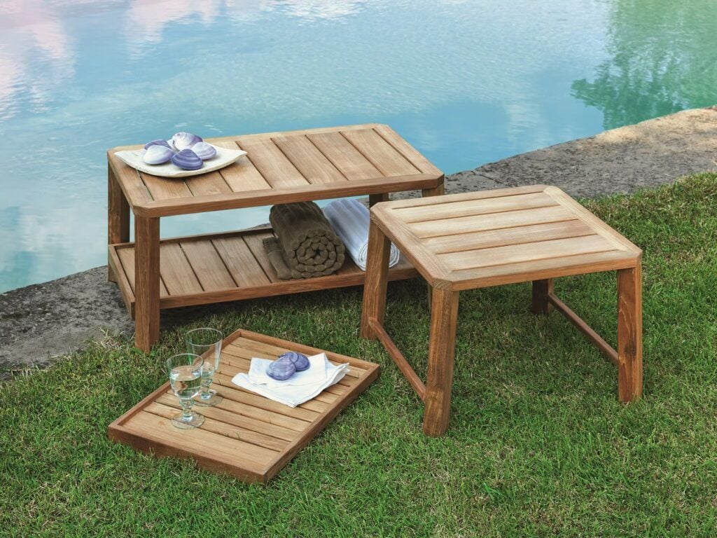 Garten-Beistelltisch aus Holz mit Tablett