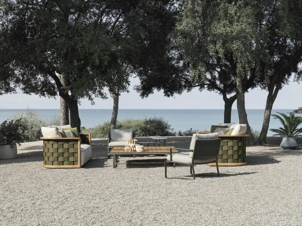Beide Tische sind mit Platten aus Teakholzlamellen oder aus Ätna-Lavastein mit emaillierter Oberfläche in den Farben Anthrazit, Olivgrün und Wüstengelb erhältlich, die mit den Farben der Kollektion und dem geflochtenen Polypropylenseil übereinstimmen. Die glasartigen Einsätze des Ätna-Lavasteins, die für die Einbrenn-Emaillierung der Oberflächen verwendet werden, stammen aus der Zerkleinerung von recyceltem Glas aus Fernseh- und PC-Monitoren.