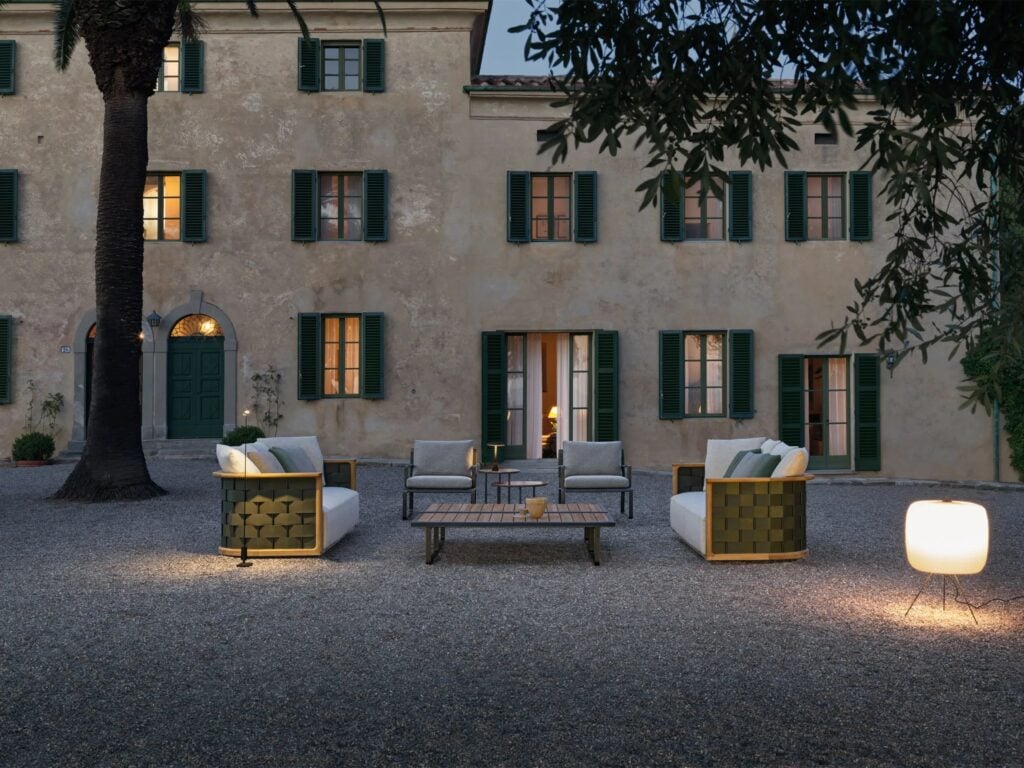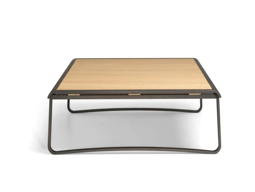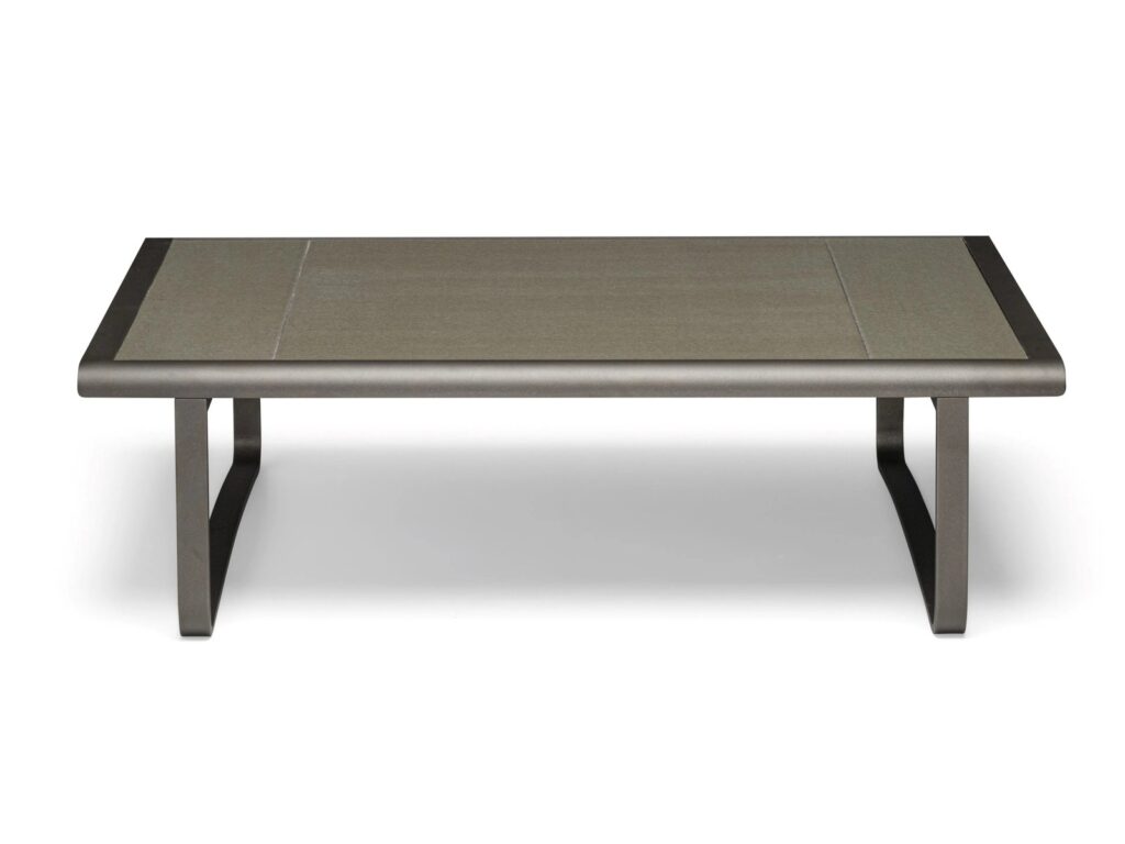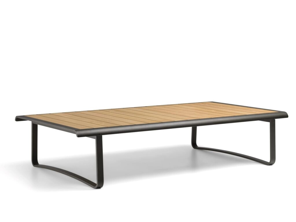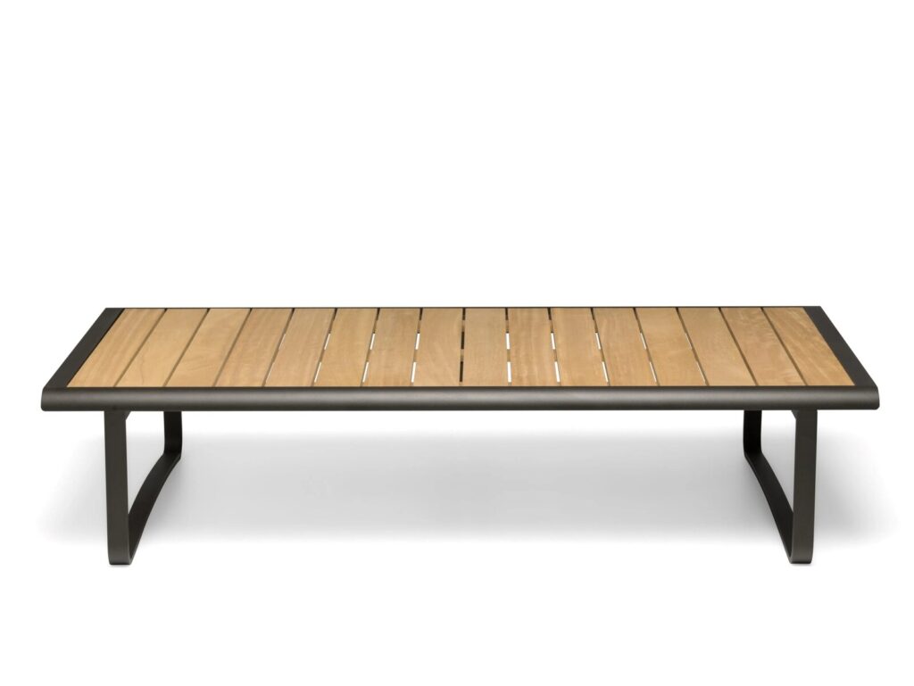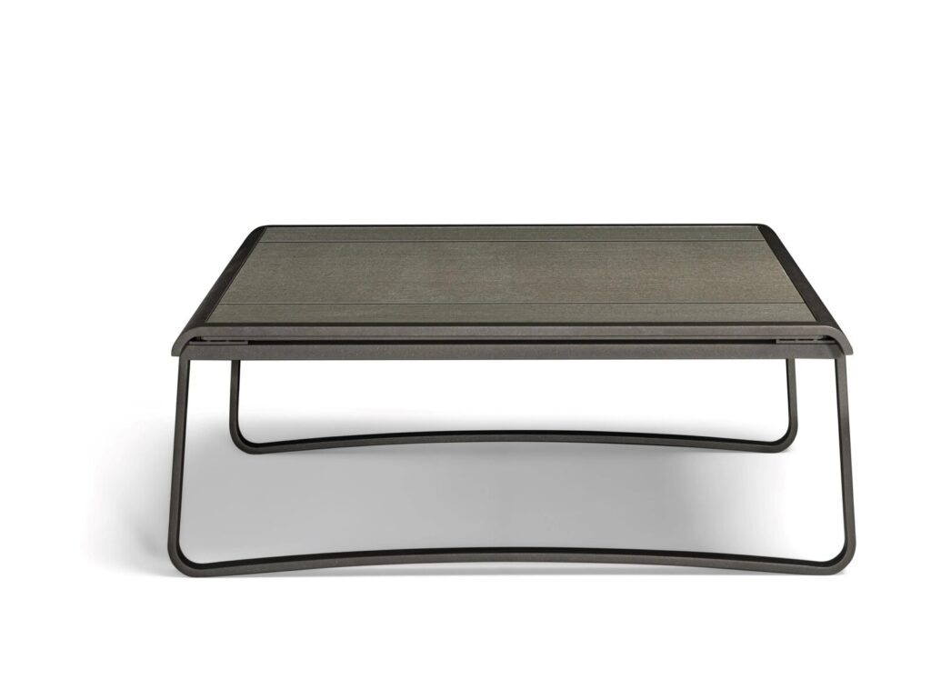 Die Outdoor-Kollektion wird durch einen grossen, niedrigen Tisch in zwei Breiten für vielseitige, intime oder gesellige Wohnbereiche im Freien ergänzt. Er greift die ästhetischen Motive der Kollektion auf, wie das brünierte Aluminiumband, die Profile und die abgerundeten Ecken. Die Sockel, die aus einem durchgehenden Band bestehen, sind von der Tischplatte zurückgesetzt, um sie optisch leichter zu machen, so als ob sie schweben würde.