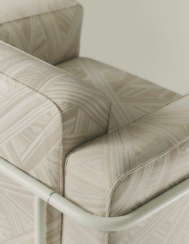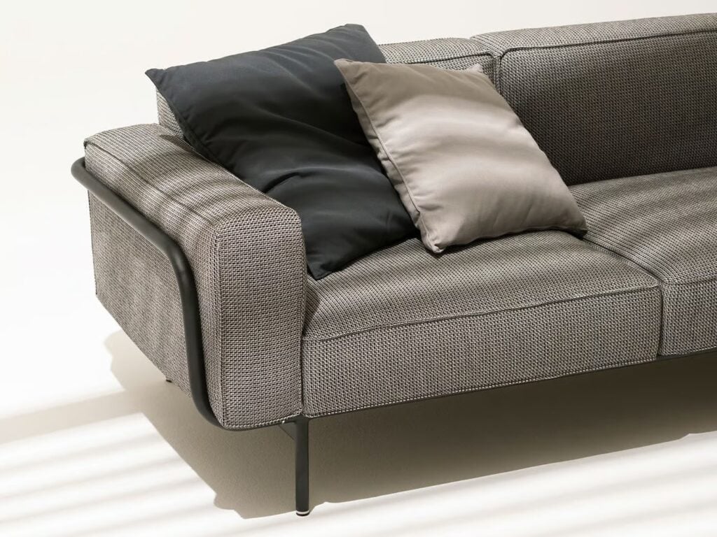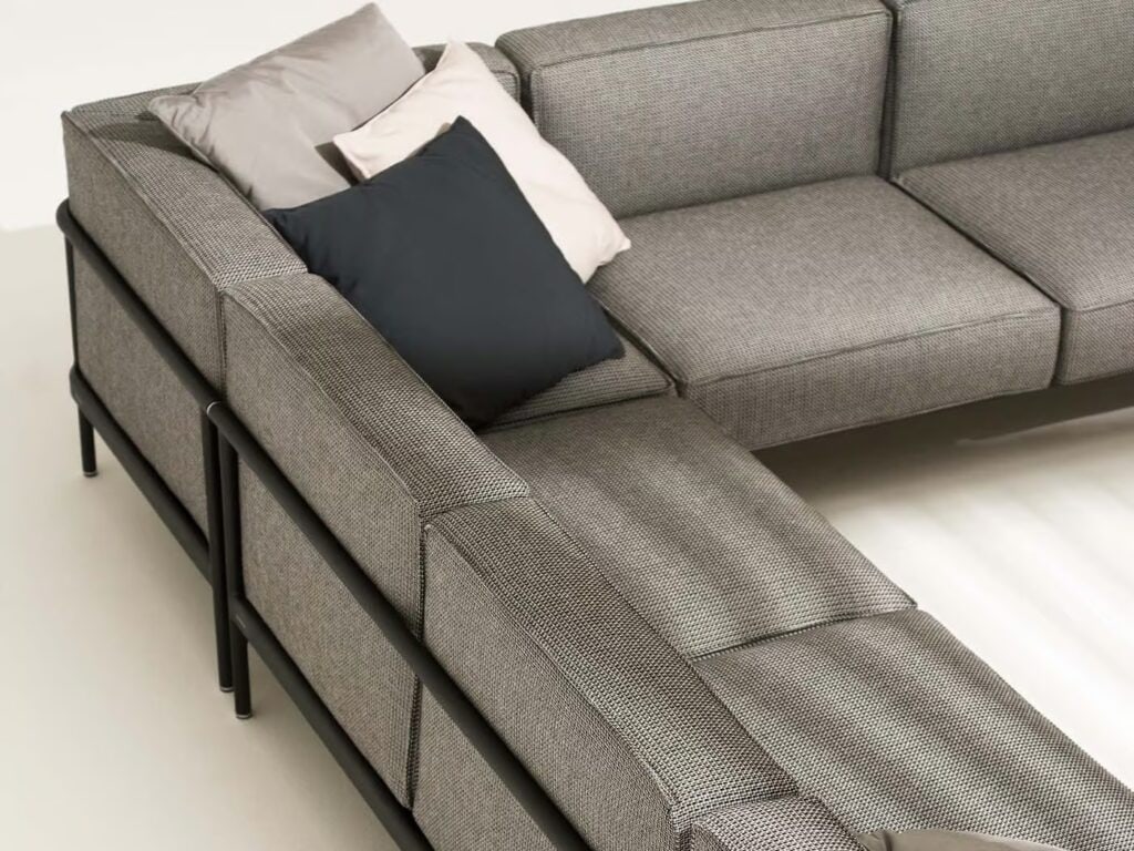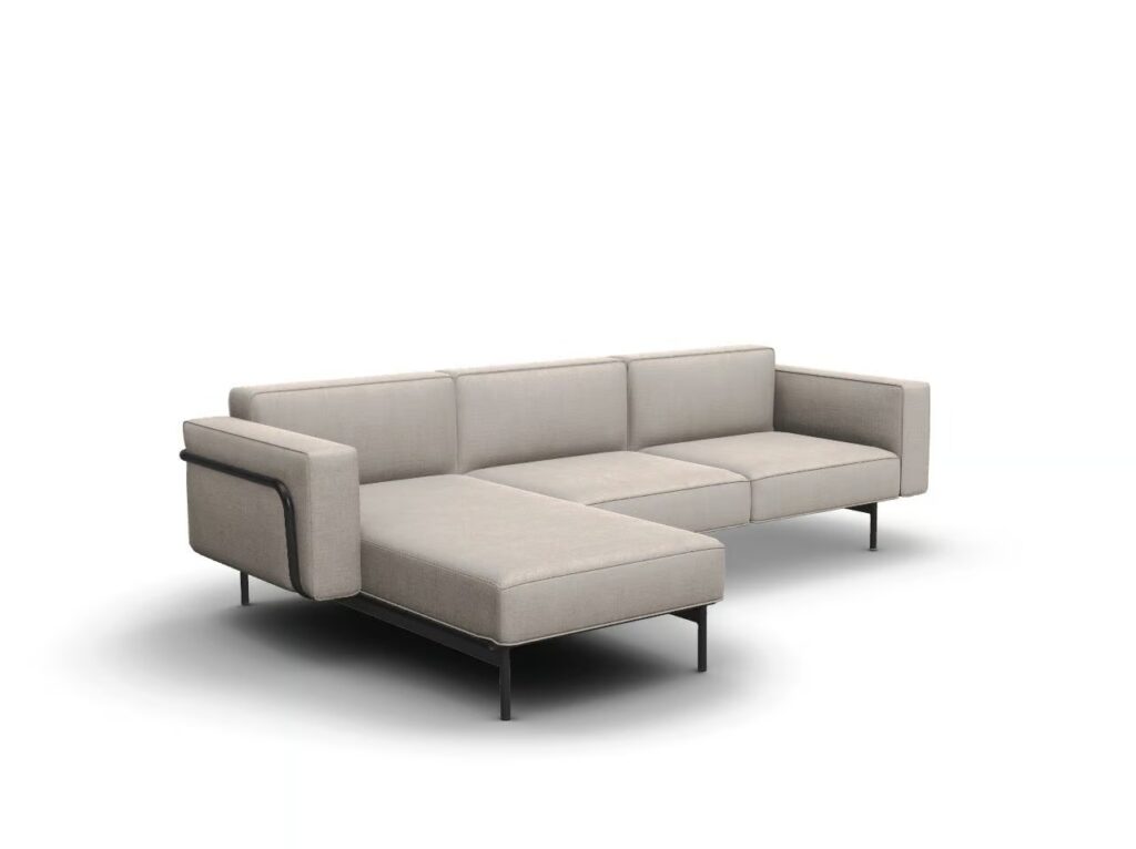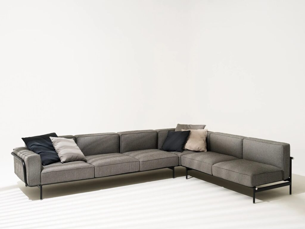 Die beiden Hauptprofile, die sich vorne unter dem Sitz und am Ende der Rückenlehne befinden, ermöglichen die Verbindung zwischen den verschiedenen Elementen und die Verlängerung des Sofas selbst, auch dank der verdeckten Verbindungen aus Aluminiumdruckguss.