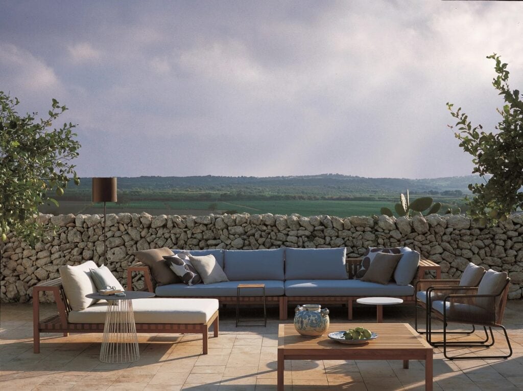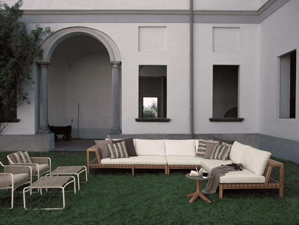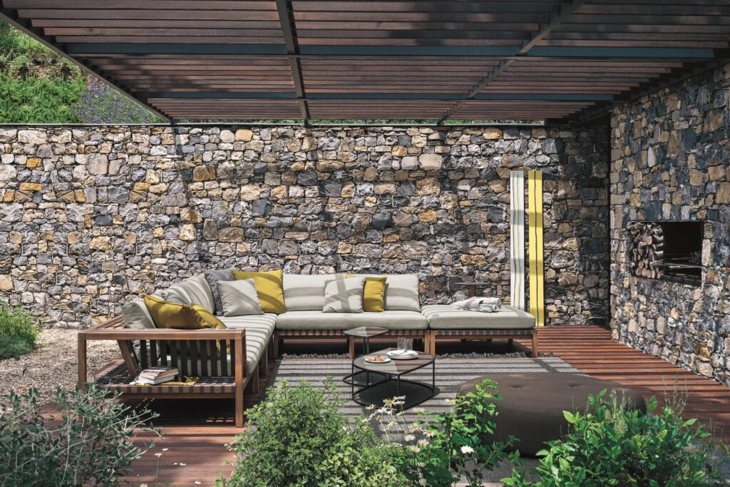 It consists of outdoor furniture that naturally extends any indoor space. The brilliant idea behind it is to transform the skeleton of an outdoor sofa’s backrest into a support for the accessories of daily leisure. The structure thus becomes both form and decor, with generous, clean, and essential seating that seems to slice through the space horizontally, in a rhythmic alternation of voids and solids.