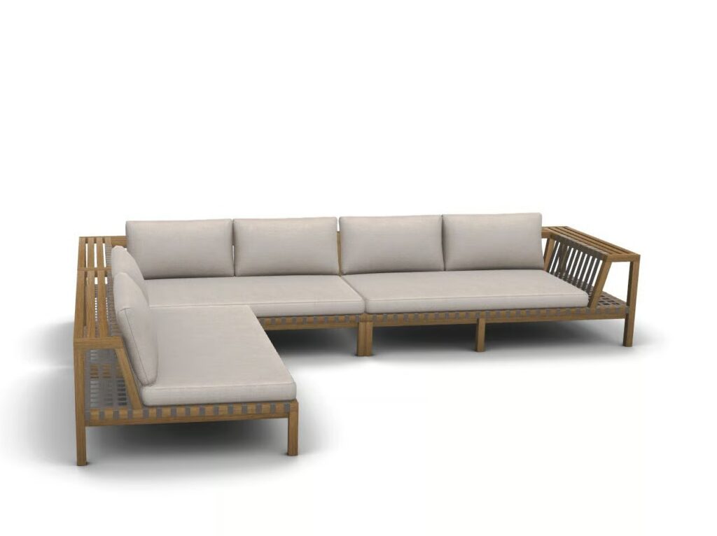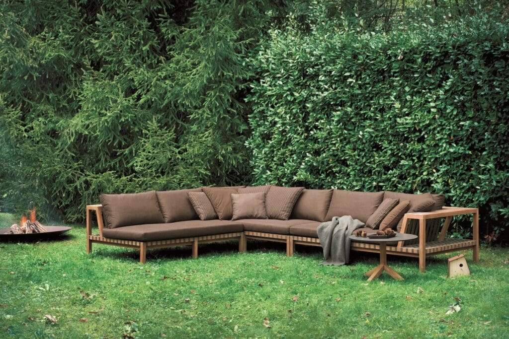 5 NETWORK is a 6-seat teak corner sofa for outdoor use.