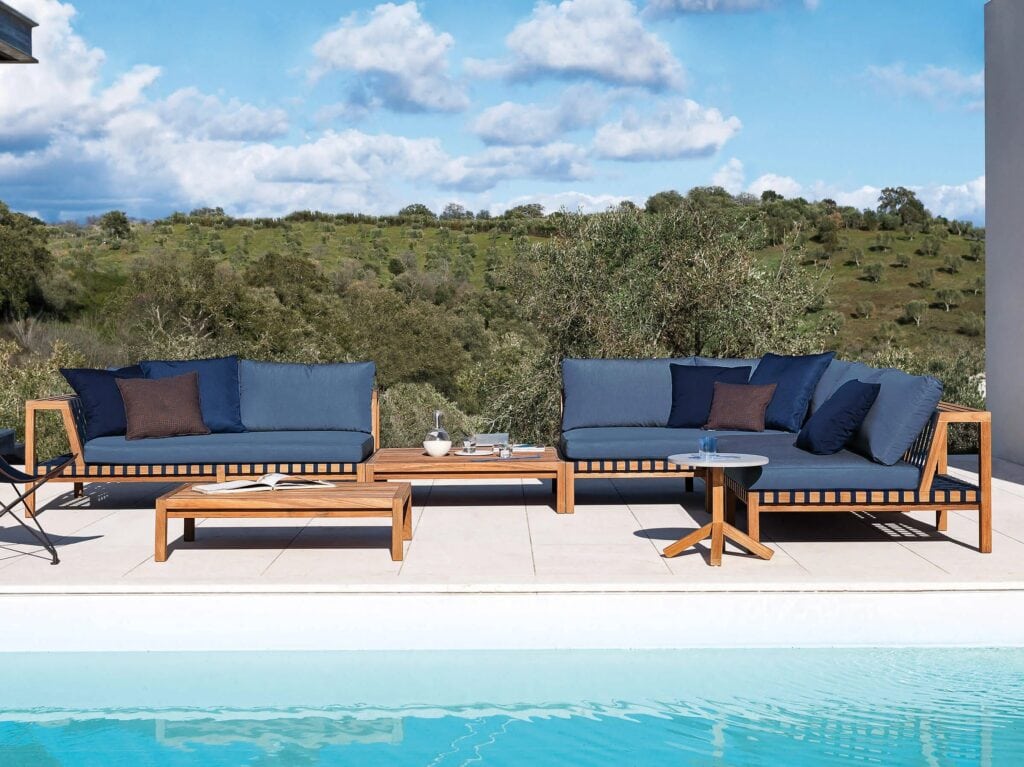 In the sofas of this collection, the structure, strongly characterized by the presence of teak, becomes both form and decor: generous, clean, and essential seating slices through the space horizontally in a rhythmic alternation of voids and solids. This elegant line of outdoor furniture stems from the idea of transforming the skeleton of the backrests into useful supports for the accessories of daily leisure, creating a true system of living and relaxation situations.