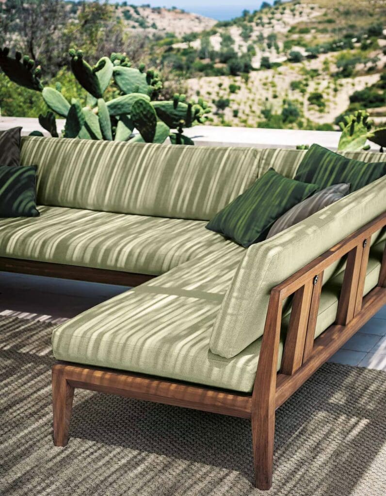 The sophistication of the design behind these outdoor sofas is also reflected in the details, such as the use of buttons that, fitting perfectly between the slats of the backrest and armrests, prevent the cushions from shifting with an original aesthetic touch.