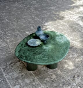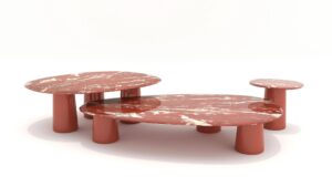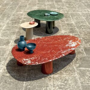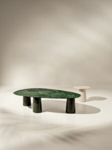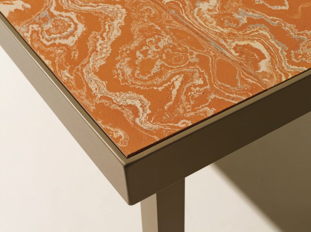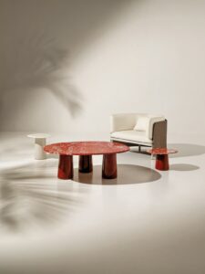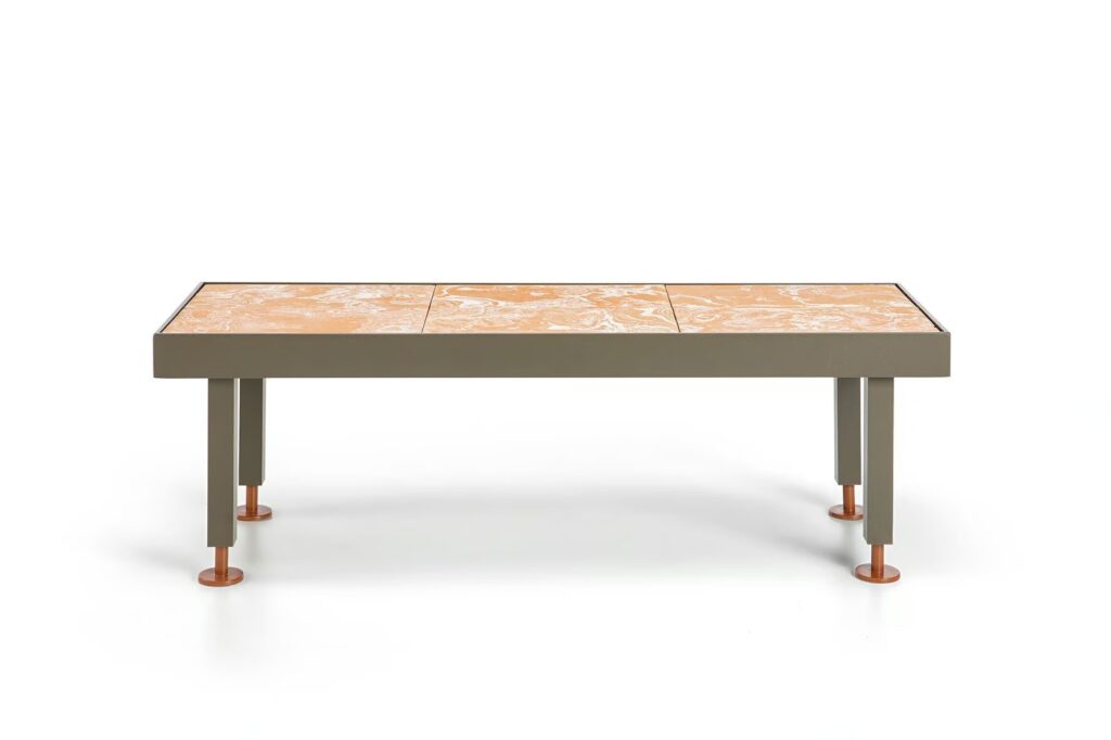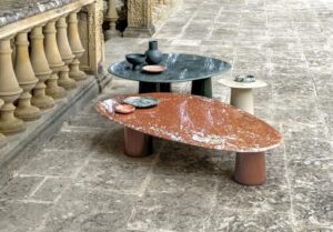 Further highlighting the line’s inspiration drawn from the botanical world is the use of variegated terracotta, a material with a distinctive marbled surface, the result of skilled handcrafting that blends different clays to create a unique and unrepeatable effect, enhancing the material’s uniqueness and value.