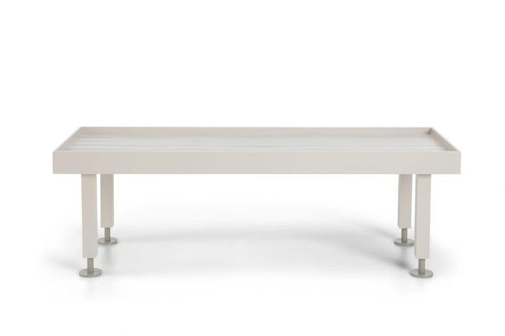 The seating surfaces are crafted in terracotta or natural teak slats. The terracotta tiles, laid side by side, form a seamless surface in soft rose or variegated tones, featuring delicate white and grey veining.