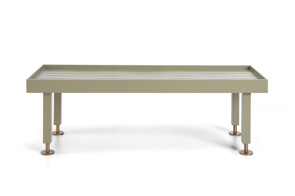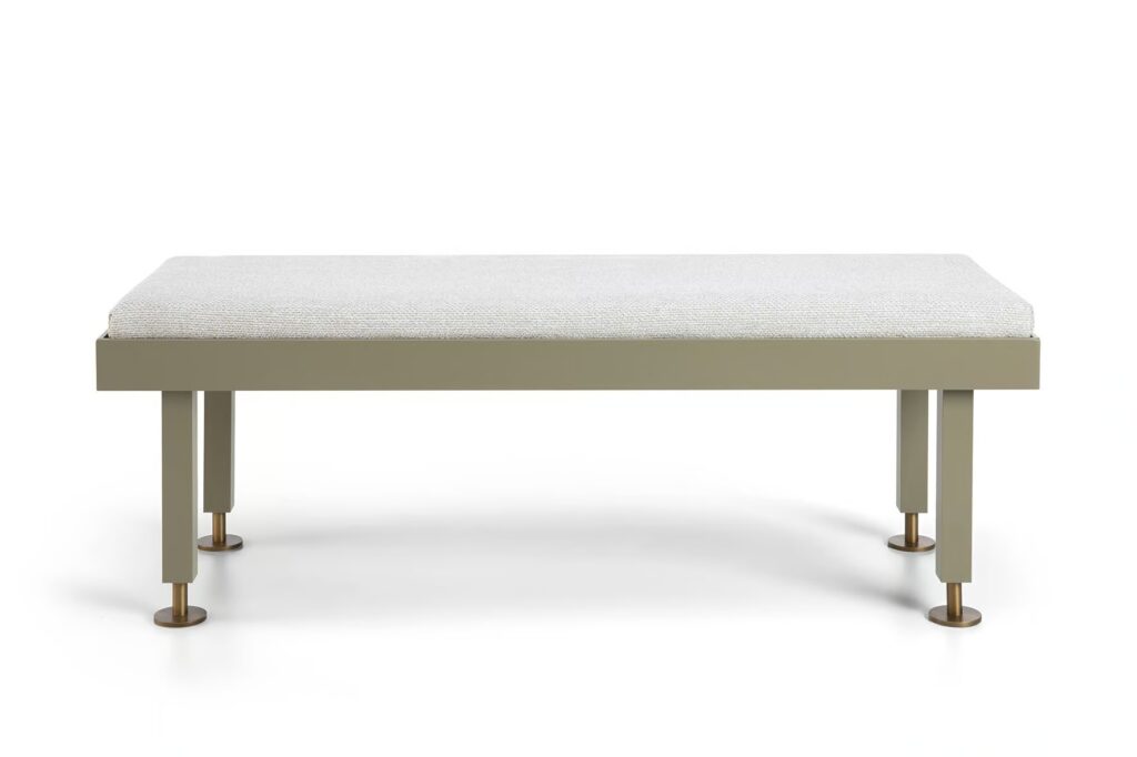 The structure is made of metal and comes in three color options: Camouflage Green with bronze feet, Camouflage Grey with Russet Scarabea feet, and Lime Stone White with Grey Gold feet.