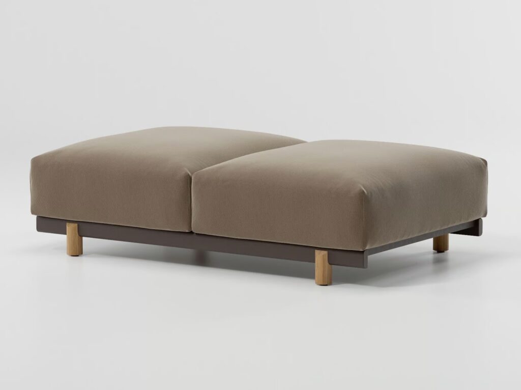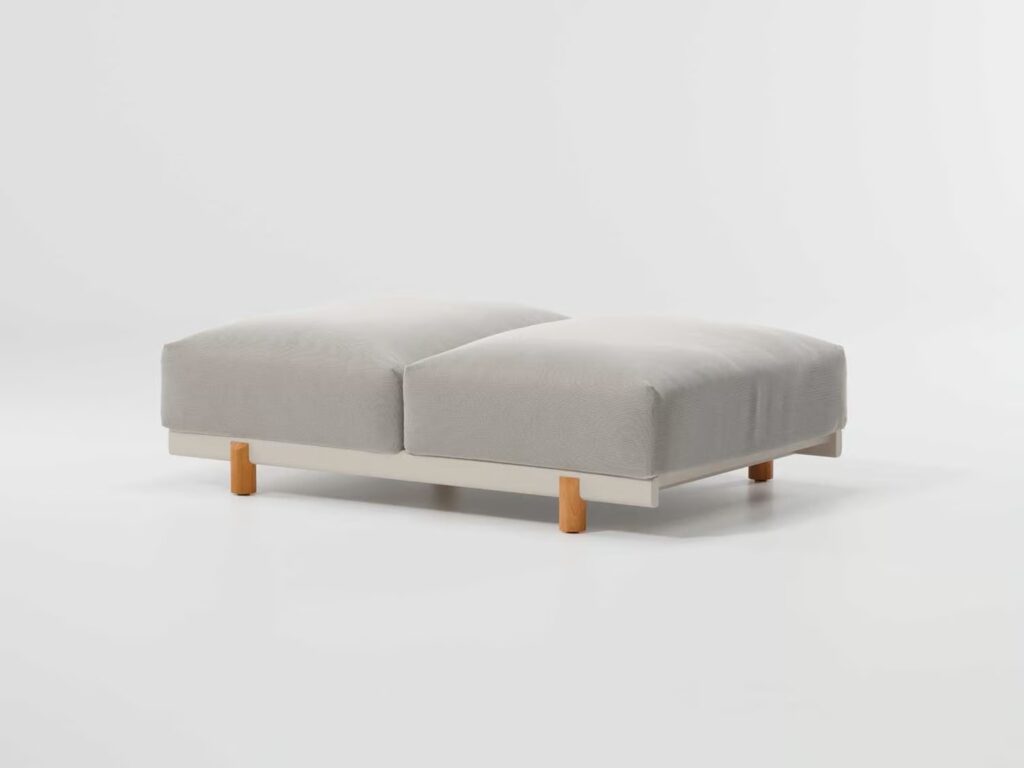 Die Darstellung eines modularen Sofas in seiner reinsten Gestalt. Seine rechtwinklige Form, die auf einer netzartigen modularen Gestaltung basiert, erlaubt eine perfekte Raumoptimierung und die Anpassungsfähigkeit an jegliche Situation. Jedes Modul macht die Schaffung neuer Verwendungen und Gestaltungen möglich, indem es auseinandergebaut und neu organisiert werden kann.