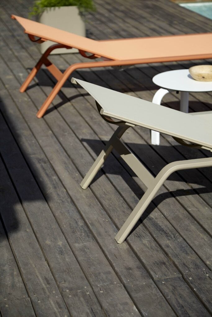 Hergestellt aus thermolackierten, geschweissten Aluminiumprofilen, Phenolplatte und Batyline-Stoff. Die Sitzpolster sind mit wasserabweisendem Stoff überzogen. Abziehbarer Bezug.