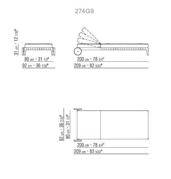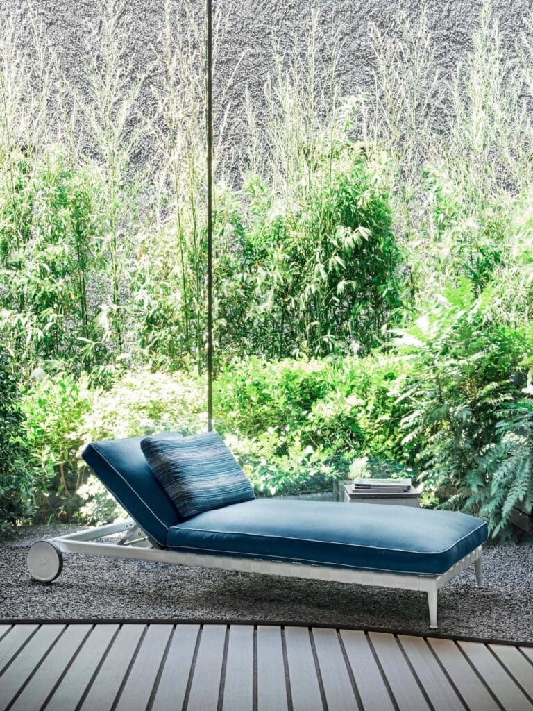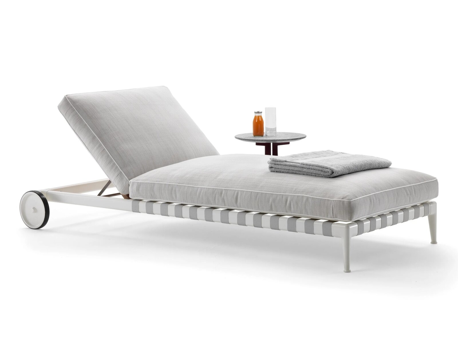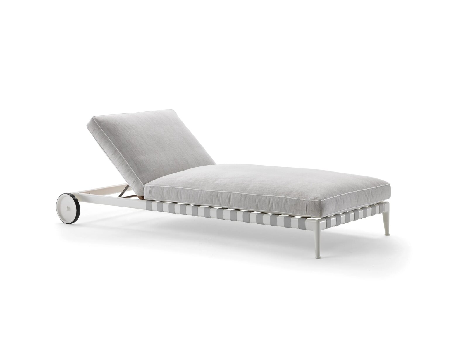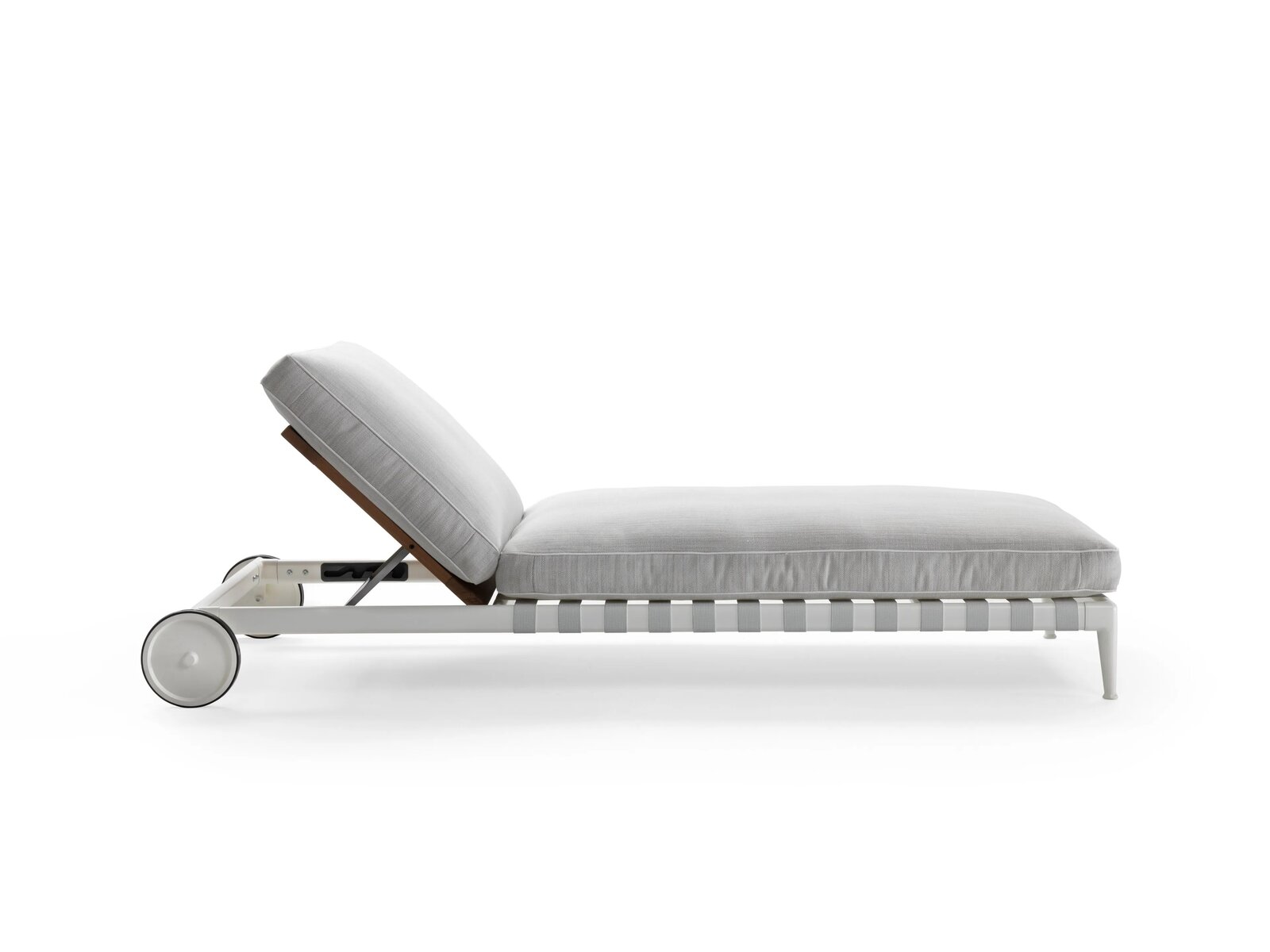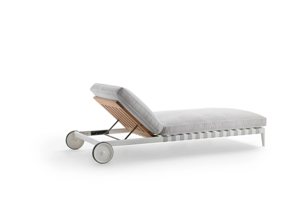 Mit einem praktischen Mechanismus kann die Neigung der Rückenlehne aus Iroko-Massivholz in verschiedenen Positionen reguliert werden. Das Daybed ist auch in der Ausführung mit hinteren Rollen aus Aluminiumguss erhältlich, mit denen sich das Daybed ganz einfach verschieben lässt.