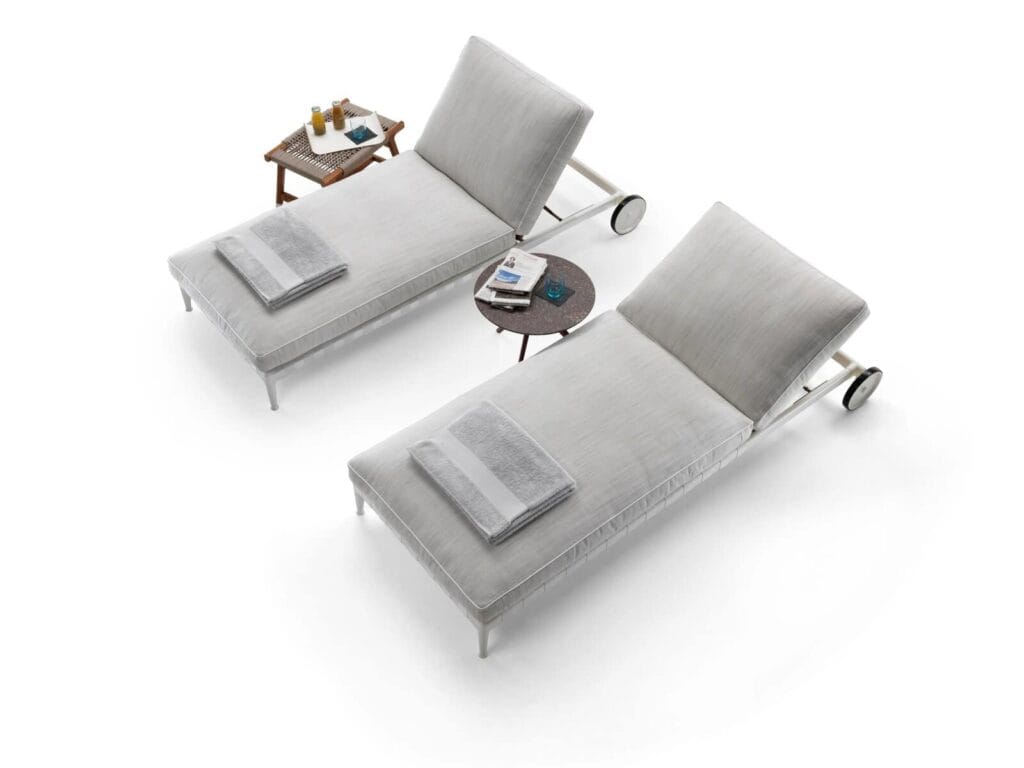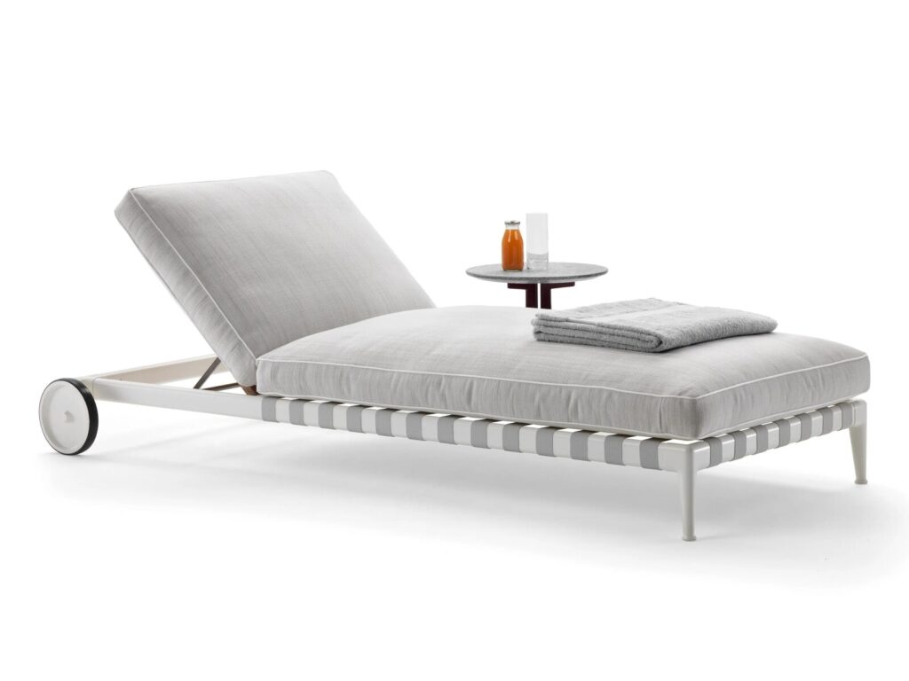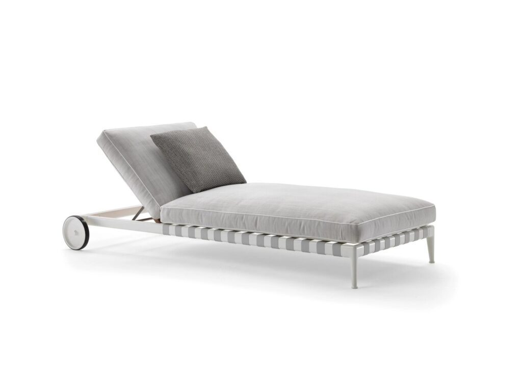Die Konfektionierung des Daybeds Atlante ist reich an Details, die den hohen Personalisierungsgrad unterstreichen. Das Gestell aus Edelstahl mit Pulverbeschichtung ist in verschiedenen eleganten Farben erhältlich, die elastischen wasserabweisenden Riemen gibt es in den Farben Weiß, Sand, Grau und Anthrazit, sodass sich ansprechende Farbkontraste oder diskrete Ton-in-Ton Kombinationen gestalten lassen.