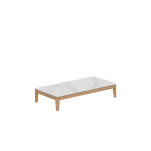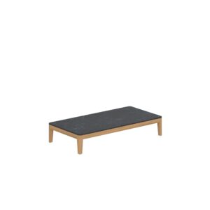 Calypso Lounge ist eine Sonnenliege aus Stoff und Teakholz.