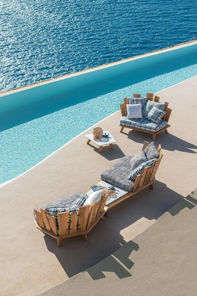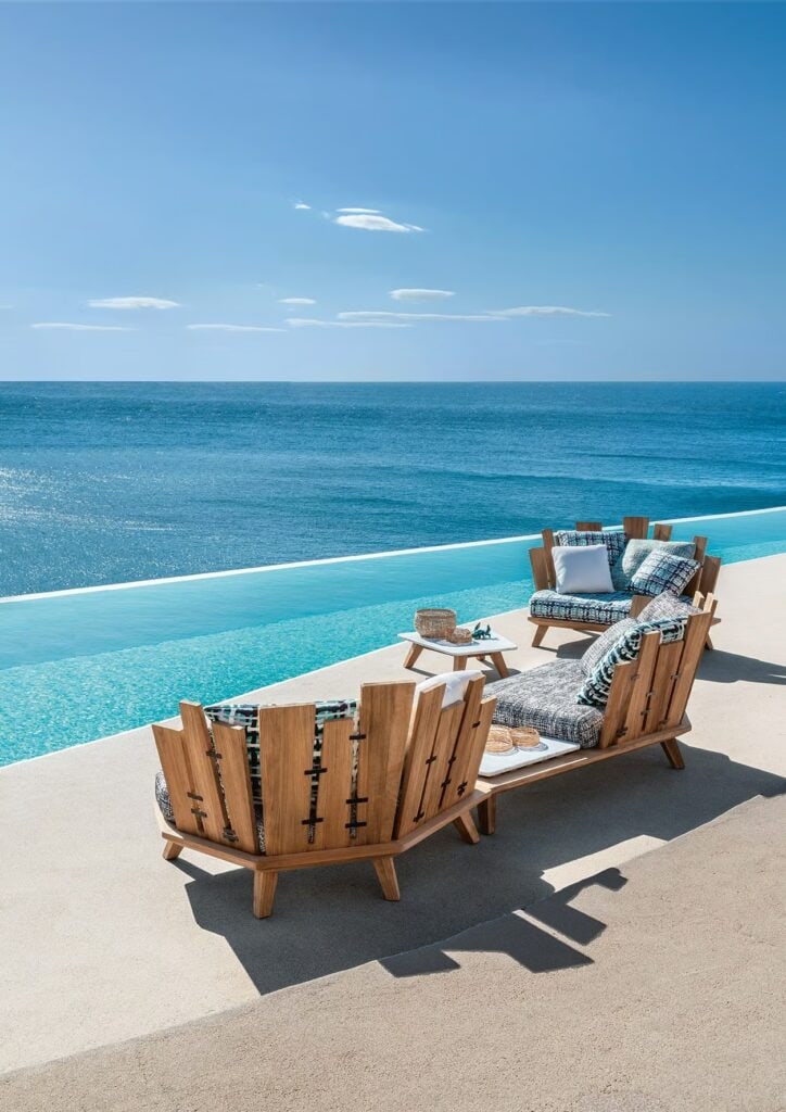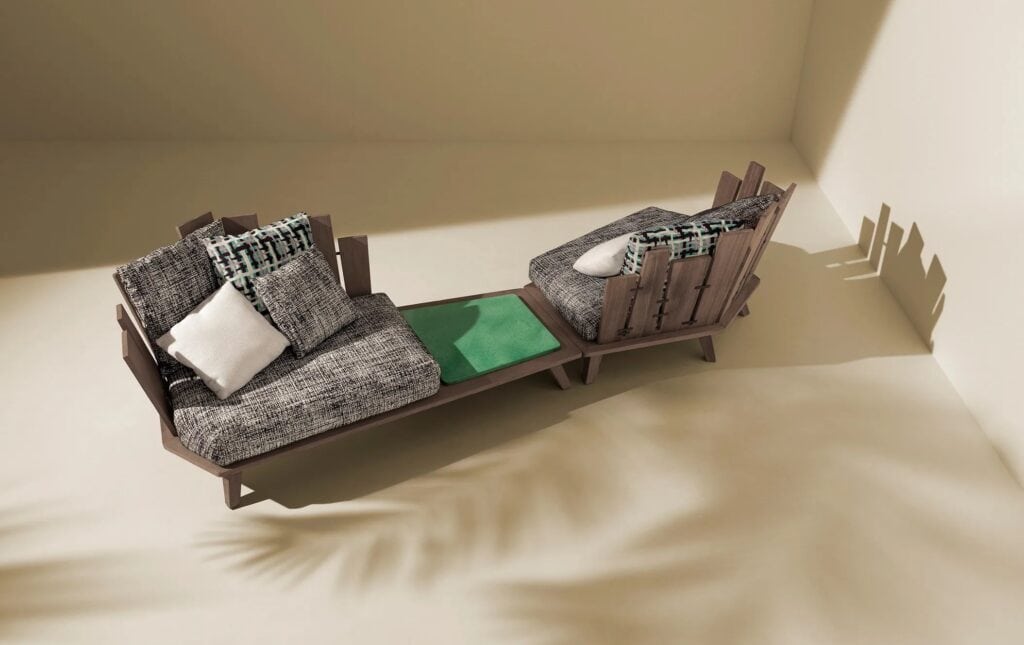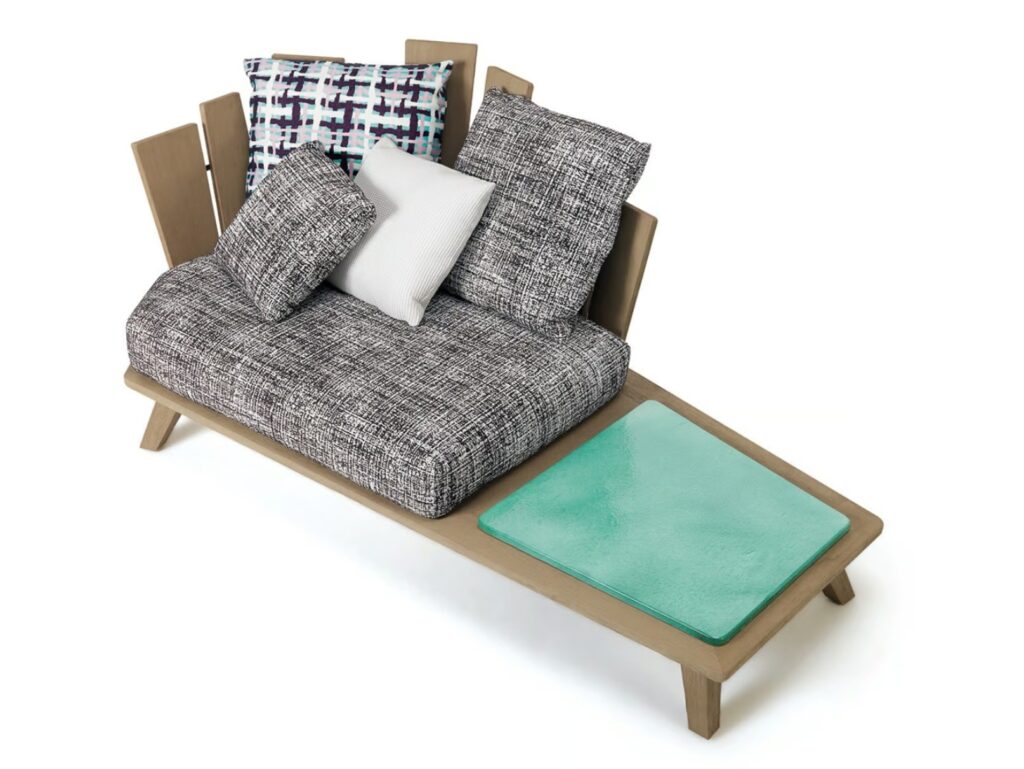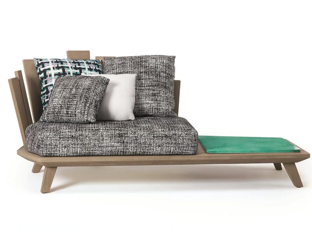 Design, Materie und Dekoration bringen so Leben in die eklektisch anmutenden robusten und einladenden Einrichtungsgegenstände mit komfortablen Volumen, die Farbenfreude und Energie versprühen. Die kunstvolle handwerkliche Verarbeitung des Teakholzes, des Marmors und des Lavasteins verbindet sich dabei mit den Farbtönen der Stoffe, die ebenfalls von Paola Navone ausgewählt wurden und die Polsterungen aufwerten.