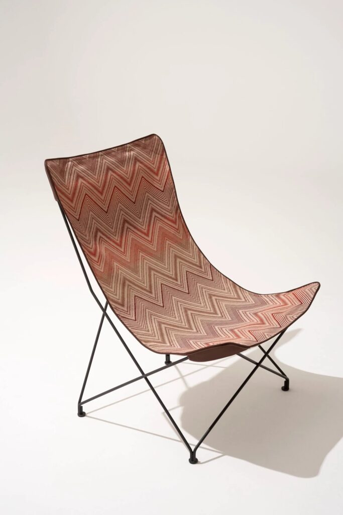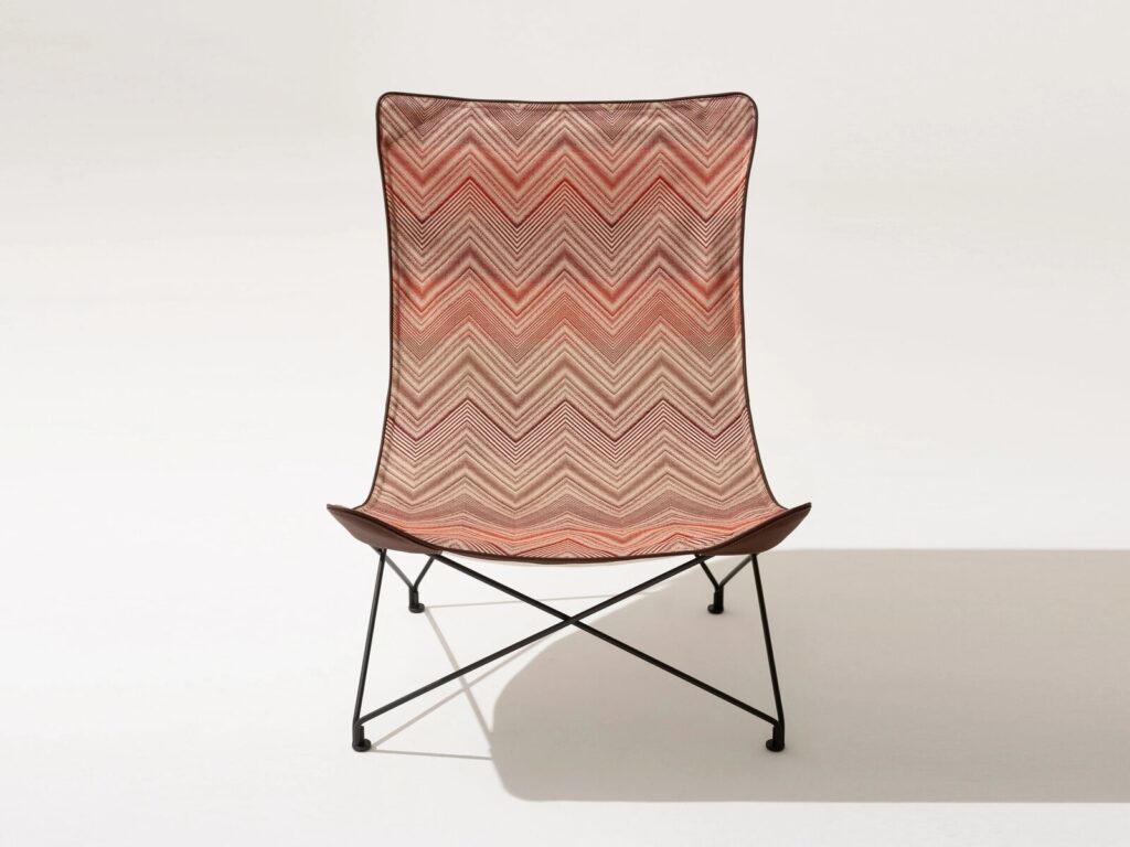 LAWRENCE, a lounge chair with an essential and elegant design, stands out for its light shapes and versatility, perfect inside and outside the home. The fabric, bordered by a profile that accompanies the geometry of the metal structure, enhances the dialogue between Roda materials and Missoni colors, coordinating with the practical stool.