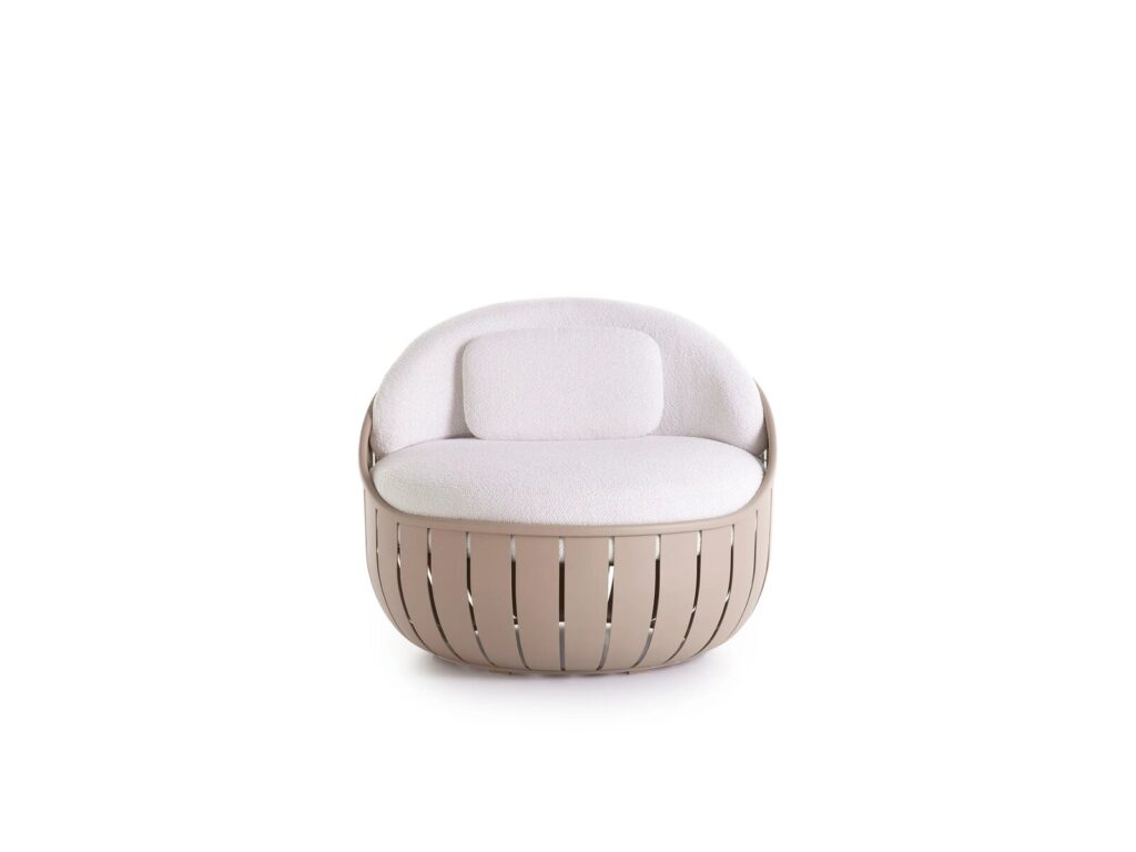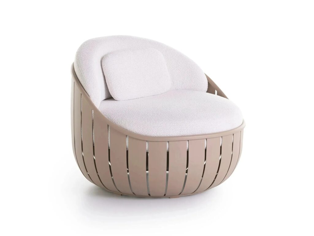 Der Lounge-Sessel Arena ist ein Designer-Sessel, dessen thermolackierte Aluminiumlamellen einzeln behandelt werden, um ihnen die perfekte Krümmung zu verleihen, so dass eine organische Struktur entsteht, die an eine grosse Umarmung erinnert.