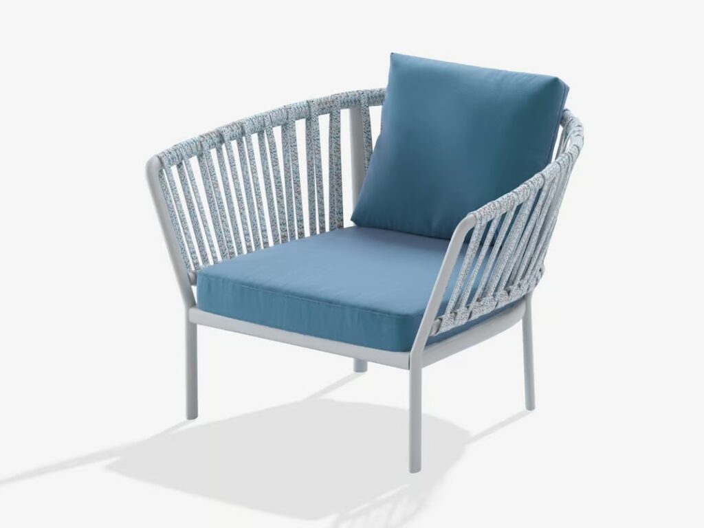 Ria ist ein Gartensessel aus lackiertem Aluminium mit einem Sitzkissen aus Stoff.