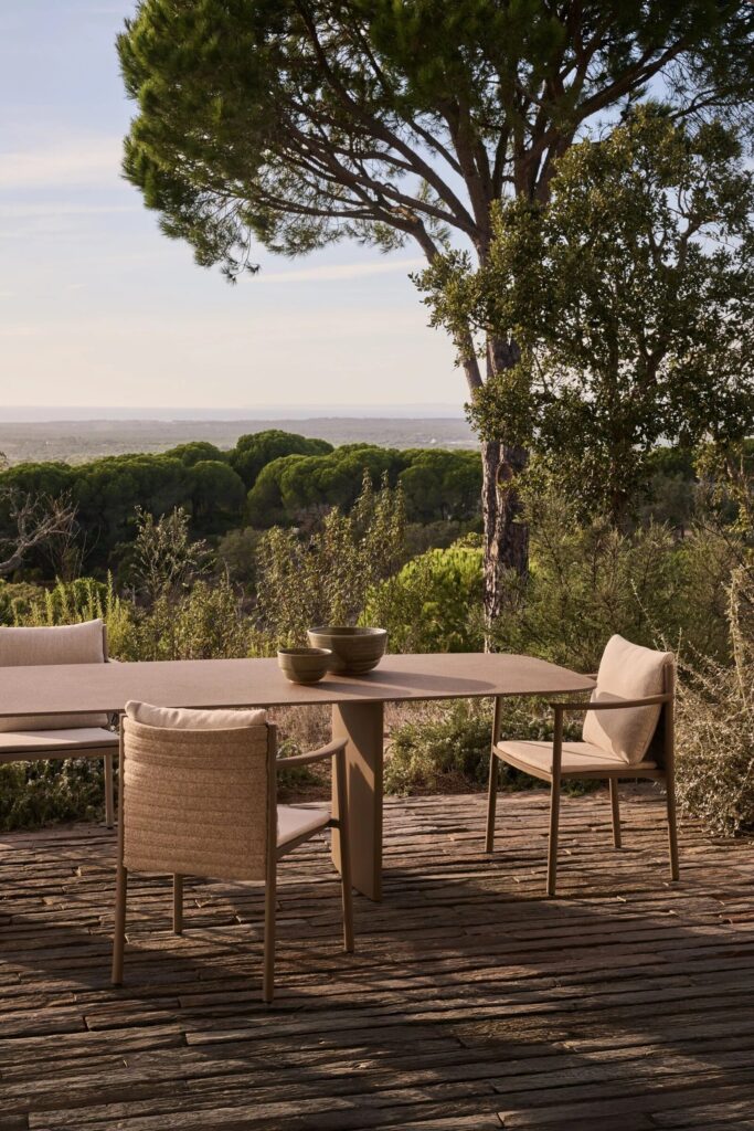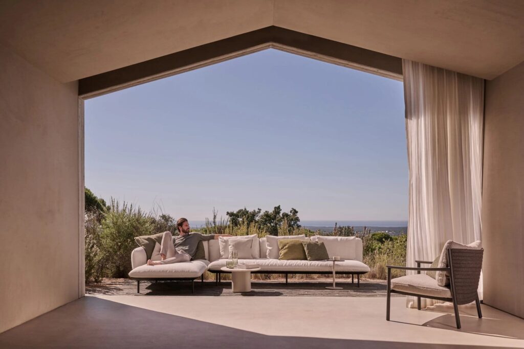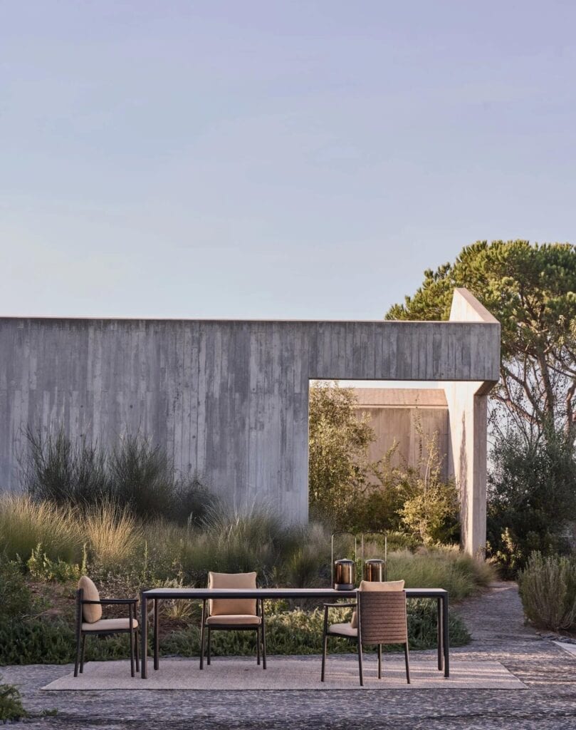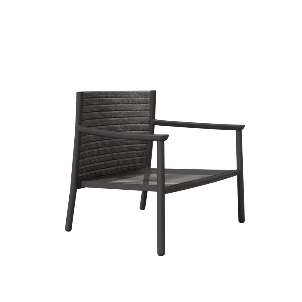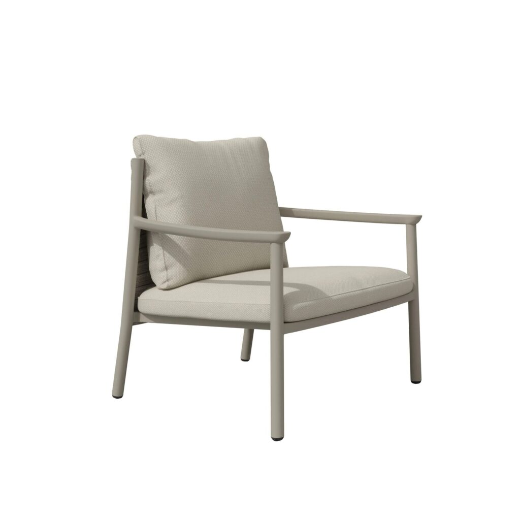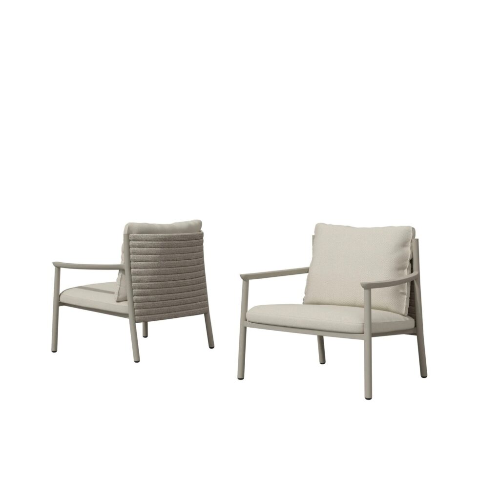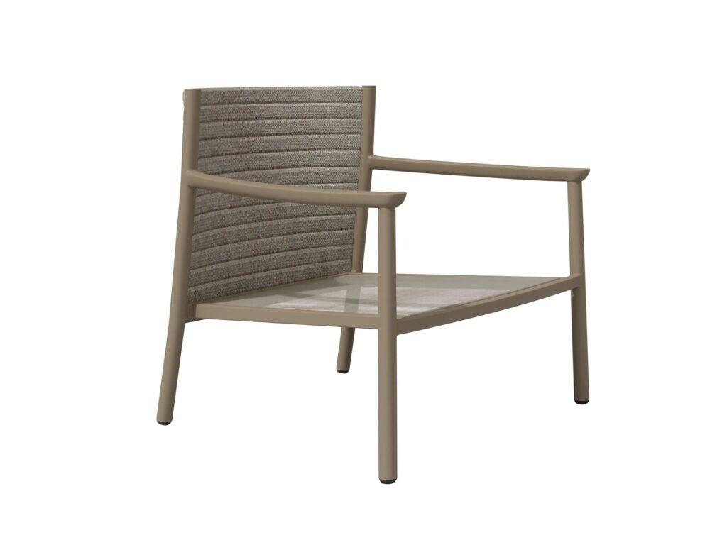 Lucca is a garden armchair made of aluminum and fabric. The woven backrest is a tribute to the traditional weaving techniques of Southern Europe. The weather-resistant EPDM foam, wrapped in wide waves of knitted Canax®, discreetly conceals the aluminum frame.