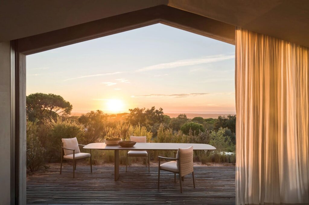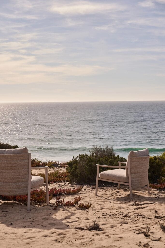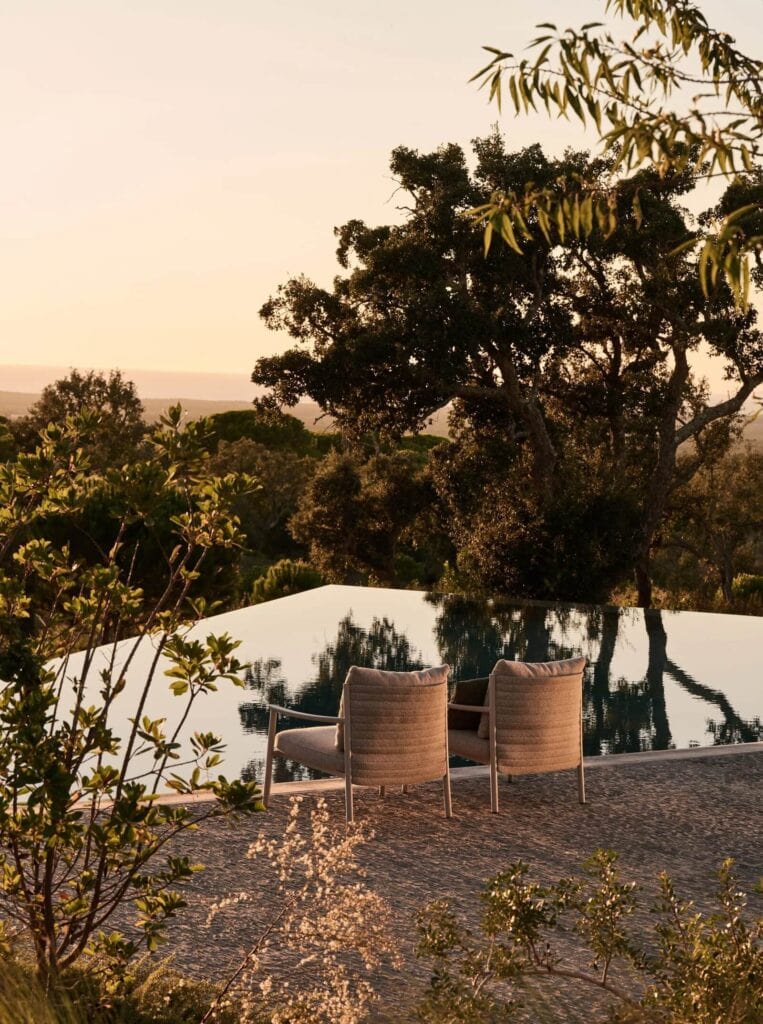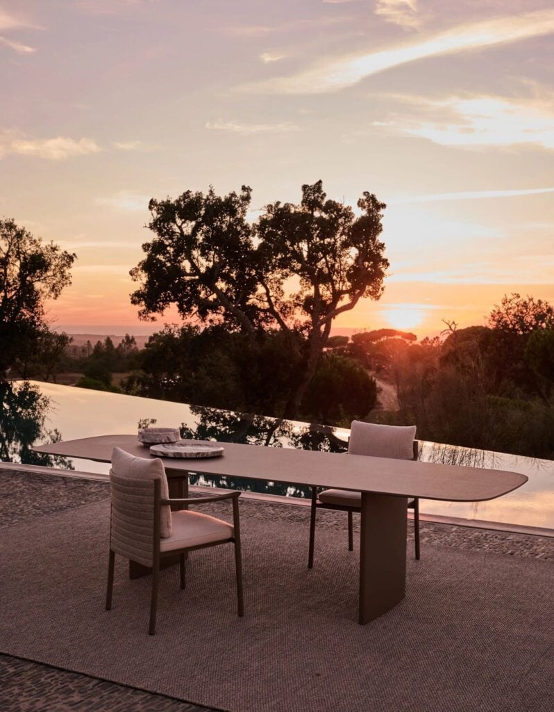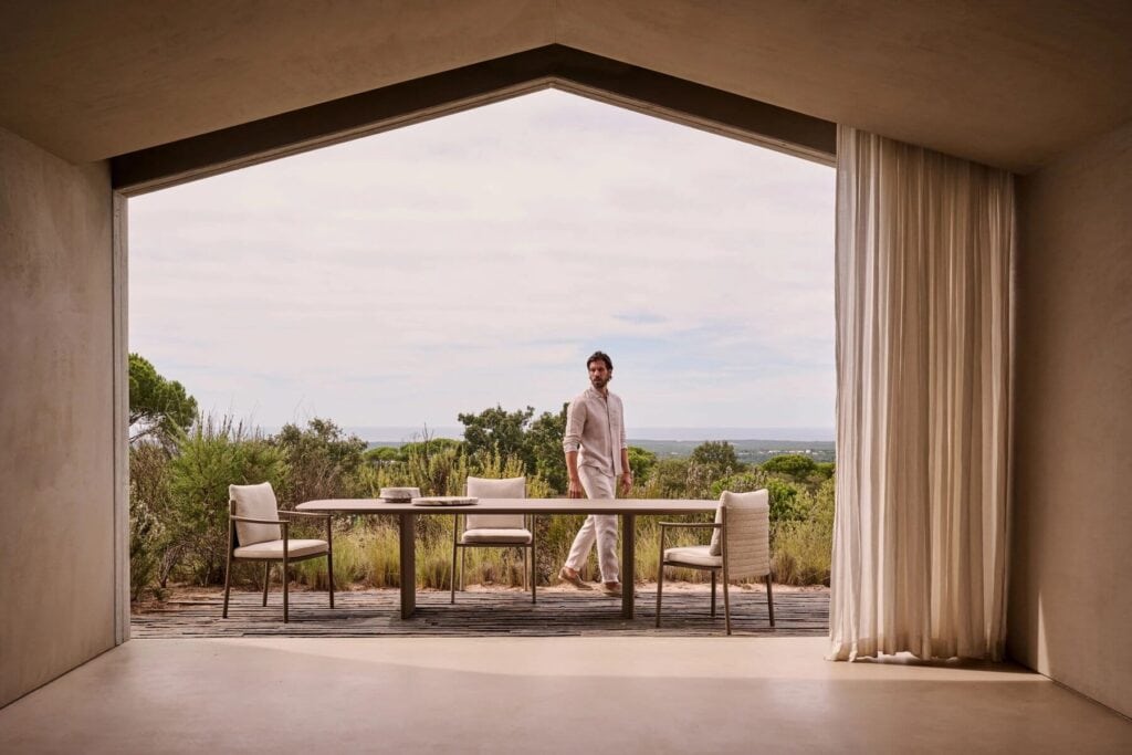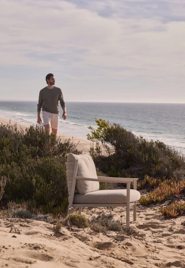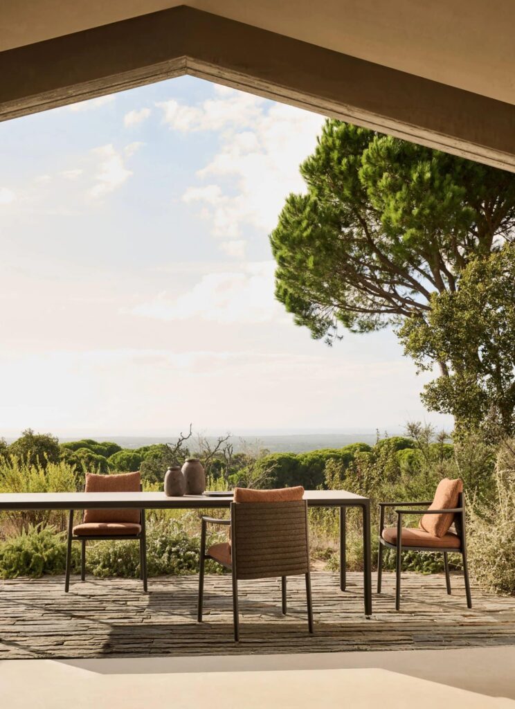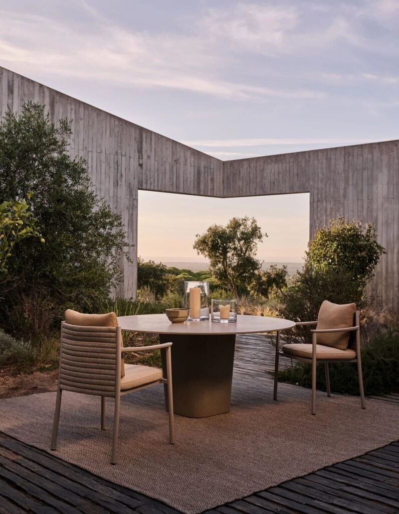 Lucca is a garden armchair made of aluminum and fabric. The woven backrest is a tribute to the traditional weaving techniques of Southern Europe. The weather-resistant EPDM foam, wrapped in wide waves of knitted Canax®, discreetly conceals the aluminum frame.