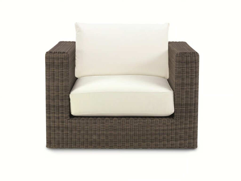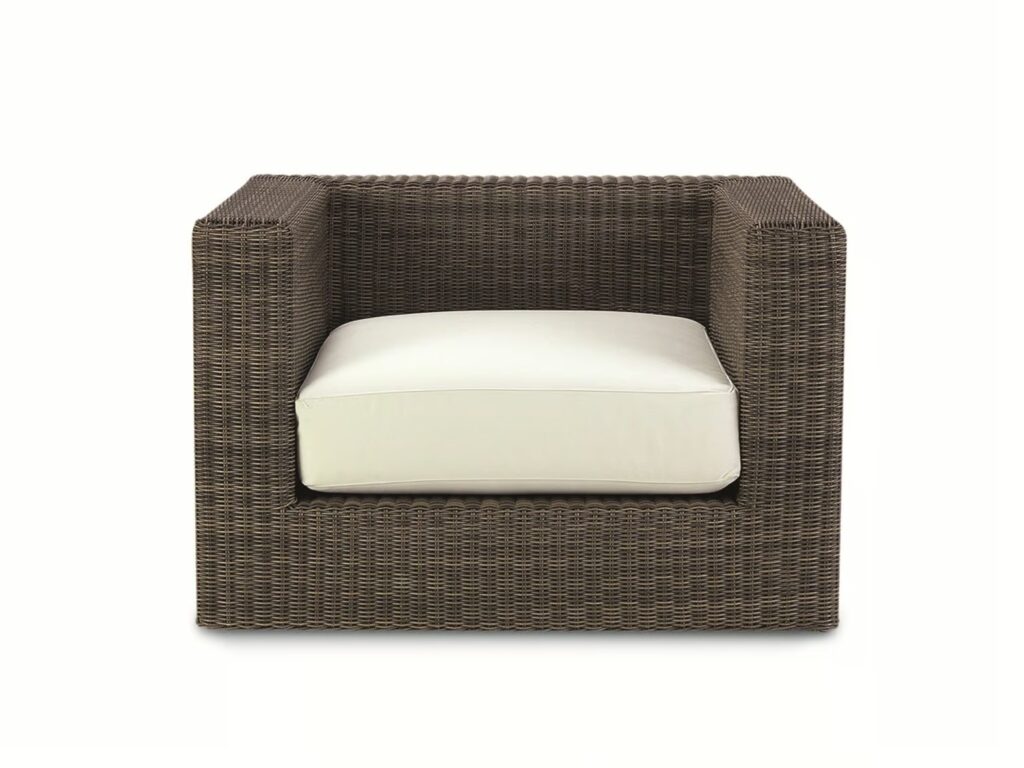 Cube ist ein Sessel aus synthetischer Etwick-Faser mit natürlicher Oberfläche, witterungsbeständig, in einem linearen Design, ideal für den Garten.