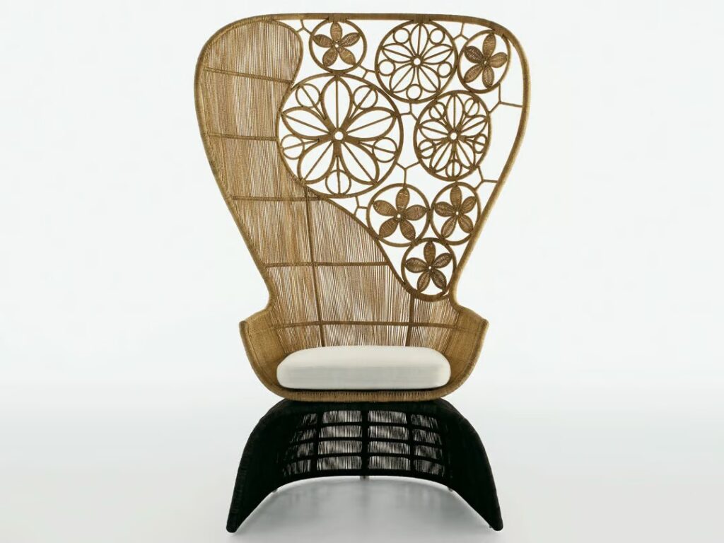 Mit Crinoline führt die forschungsarbeit von Patricia Urquiola zu dreidimensionalen mustern und weichen, geschwungenen formergebnissen. Stühle, kleiner sessel und sessel unterscheiden sich in form und höhe. Zu den schwarz-weiss und schwarz-bronzefarben polyethylenfaser-geflechten gesellen sich mit seil natur oder bronzefarben. Unterschiedlich sind die untergestell: aus edelstahl glänzend oder mit ausführungen entweder analog oder im kontrast zur sitz. Der kleine runde sessel wird durch den auf sitz und rückenlehne gelegten poncho aus natur, magenta oder bronzefarben seil noch effektvoller. Im einklang mit der serie crinoline, weist auch der tisch die runden formen auf, die sitze und das polyethylenfaser-geflecht kennzeichnen, erhältlich in zwei verschiedenen ausführungen: schwarz-weiss oder schwarz-bronzefarben. Das untergestell besteht aus zwei miteinander verbundenen, kelchförmigen elementen und dient als auflage für die tischplatten aus glas weiss oder hpl laminat geschichtet full color weiss mit durchgehenden, strahlenförmig angeordneten version kann zudem in der mitte ein sonnenschirm angebracht werden.