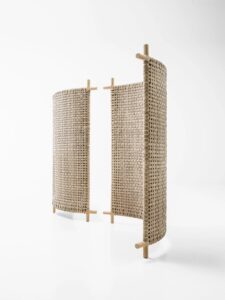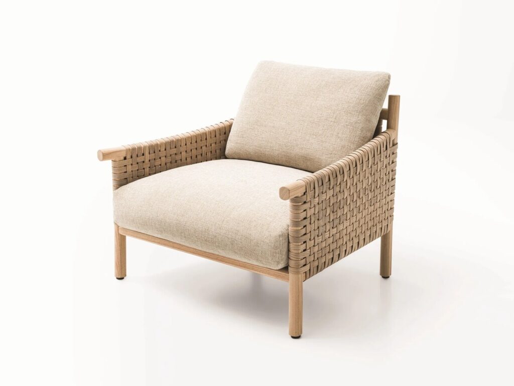 Die Serie Kiori besteht aus einem Sessel sowie zwei- und dreisitzigen Sofas. Die Struktur aus Sassafras-Kernholz ist mit einem handgeflochtenen Conwood-Gewebe überzogen, einem Material, das aus Abonos™-Ulmen-Kernholzstreifen besteht, die mit einer Korkunterlage verbunden sind, die sie gleichzeitig elastisch und widerstandsfähig macht. Die Sitz- und Rückenkissen aus Polyesterfaser mit Polyurethan-Schaumstoff sind unabhängig und mit abnehmbarem Bezug in allen exklusiven Outdoor-Stoffen der Kollektion erhältlich.