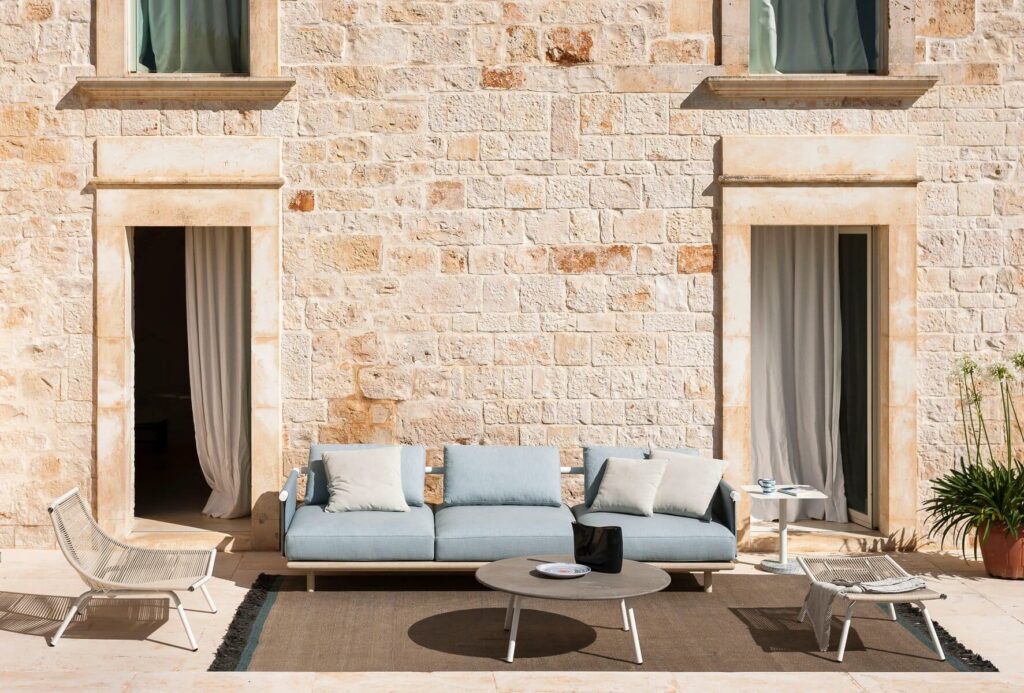 The collection is completed with a sofa, offered with only the seat cushion, a dining chair with and without armrests, and a large pouf footrest. Multiple color variants, offered by combinations of structure and rope, allow for maximum customization of outdoor furniture.