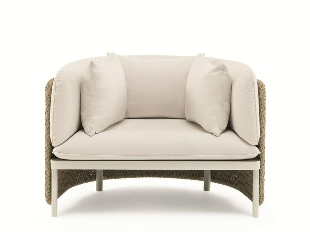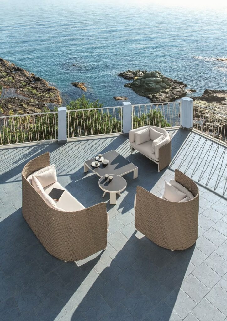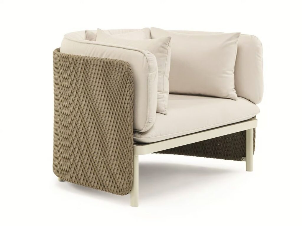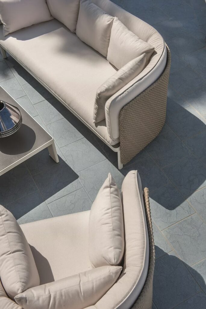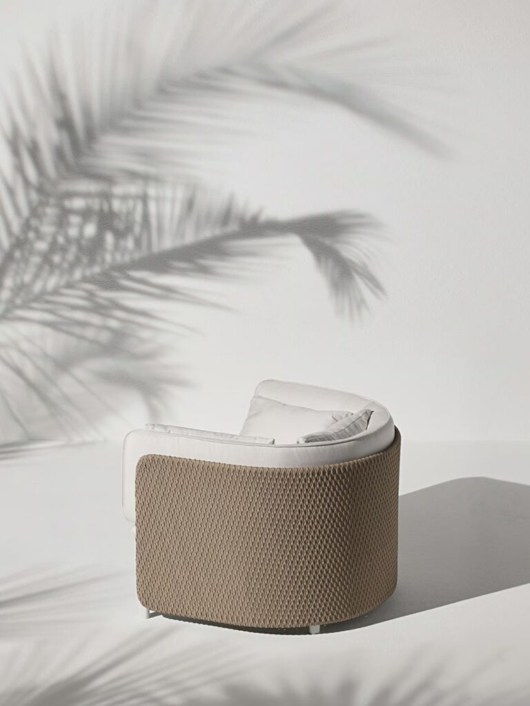 Die von Luca Nichetto entworfene Outdoor-Kollektion Esedra, der Star des neuen Ethimo-Katalogs, besticht durch ihre Ästhetik und ungewöhnliche Texturen. Zur Zeit der alten Römer war die "Exedra" ein halbkreisförmiger Raum, in dem gesellschaftliche Versammlungen und philosophische Debatten stattfanden. Die Kollektion Esedra lehnt sich an dieses Element der klassischen Architektur an, um ein komplettes Sortiment an Möbeln für einen zeitgenössischen Look im Freien zu schaffen. Dabei wird eine Beziehung zwischen den verschiedenen Materialien hergestellt, wie z. B. der Kunstfaser für die Rückenlehnen, die mit einer Technologie behandelt wird, die das Gefühl von gewebten Naturfasern vermittelt, der Stoffbezug der Kissen und die Aluminiumbeine.