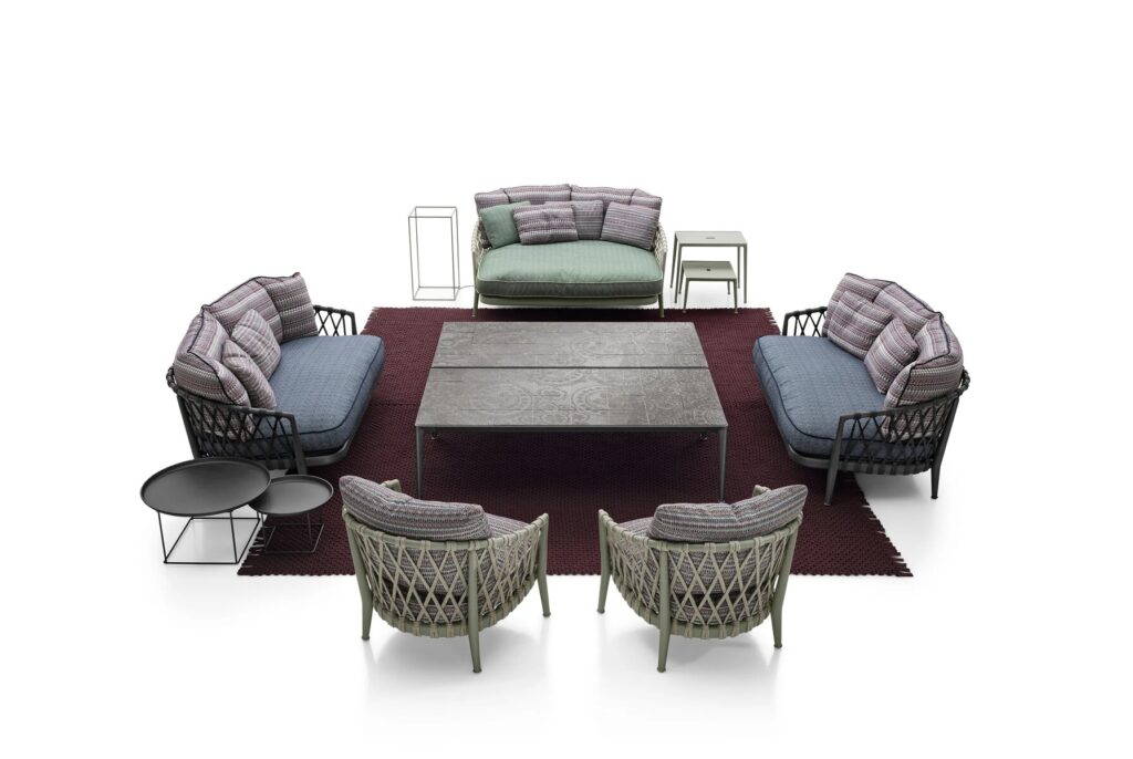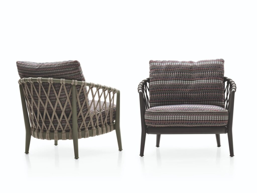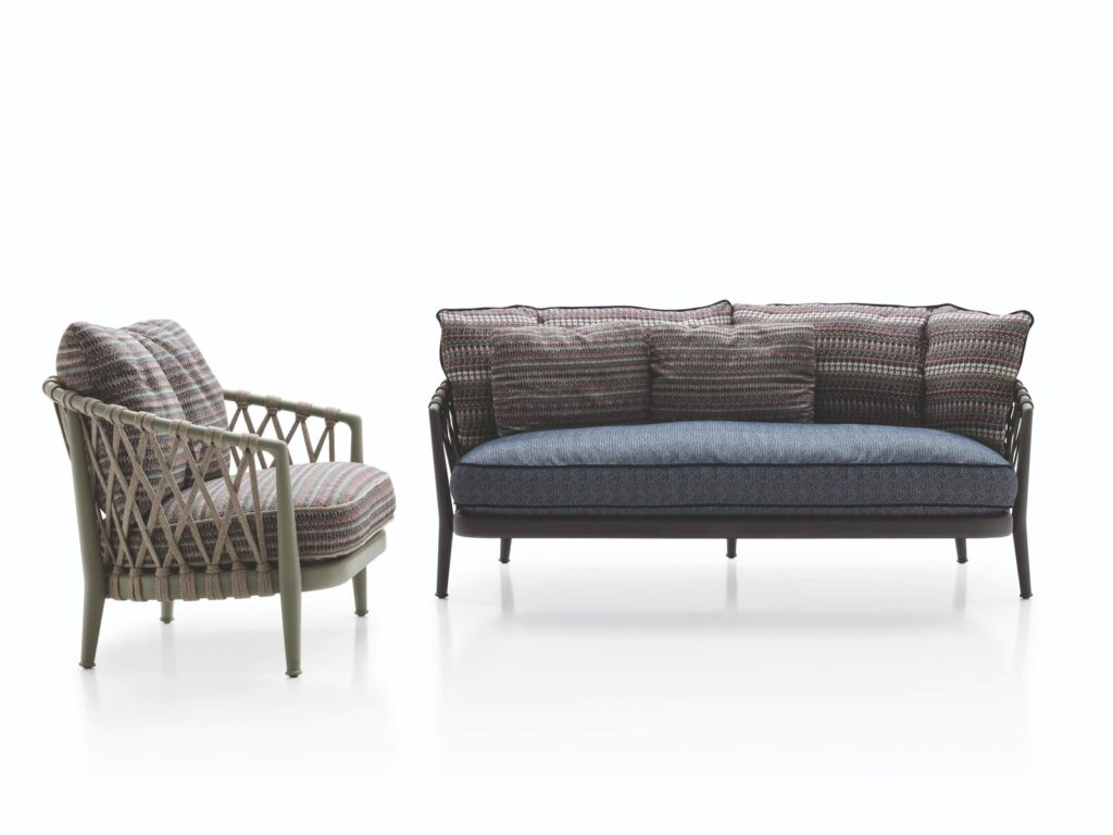 Die aus Sofas, Stühlen und Sesseln bestehende Kollektion Erica, 2017 mit großem Erfolg präsentiert, wird durch neue Sofamodelle ergänzt. Sie verfügen über die charakteristischen Merkmale der Serie, wie die gebogene Rückenlehne und das Flechtwerk, unterscheiden sich jedoch durch eine tiefere Sitzfläche und ihren “Used-Look”. Die Sofas sind in drei besonders komfortablen Größen erhältlich - 170 und 216 cm mit Sitz von 96 cm Tiefe und 153 cm mit Sitz von 140 cm Tiefe. Die Kissen sind mit einer neuen Polsterung versehen, die ihnen ein weiches und natürliches Aussehen verleiht, so dass sie zu echtem Relax einladen. Neu sind auch die Farbkombinationen: anthrazit, tortora für Gestell und Flechtwerk oder Gestell im Farbton salbei mit naturfarbenem Flechtwerk. Sie können mit einer breiten Auswahl an Kissenbezügen in zahlreichen Farbnuancen und Mustern kombiniert werden, die jeweils aufeinander abgestimmt sind. Vervollständigt wird die Serie durch einen Armstuhl, dessen Rückenlehne durch ein neues Flechtdesign besticht.