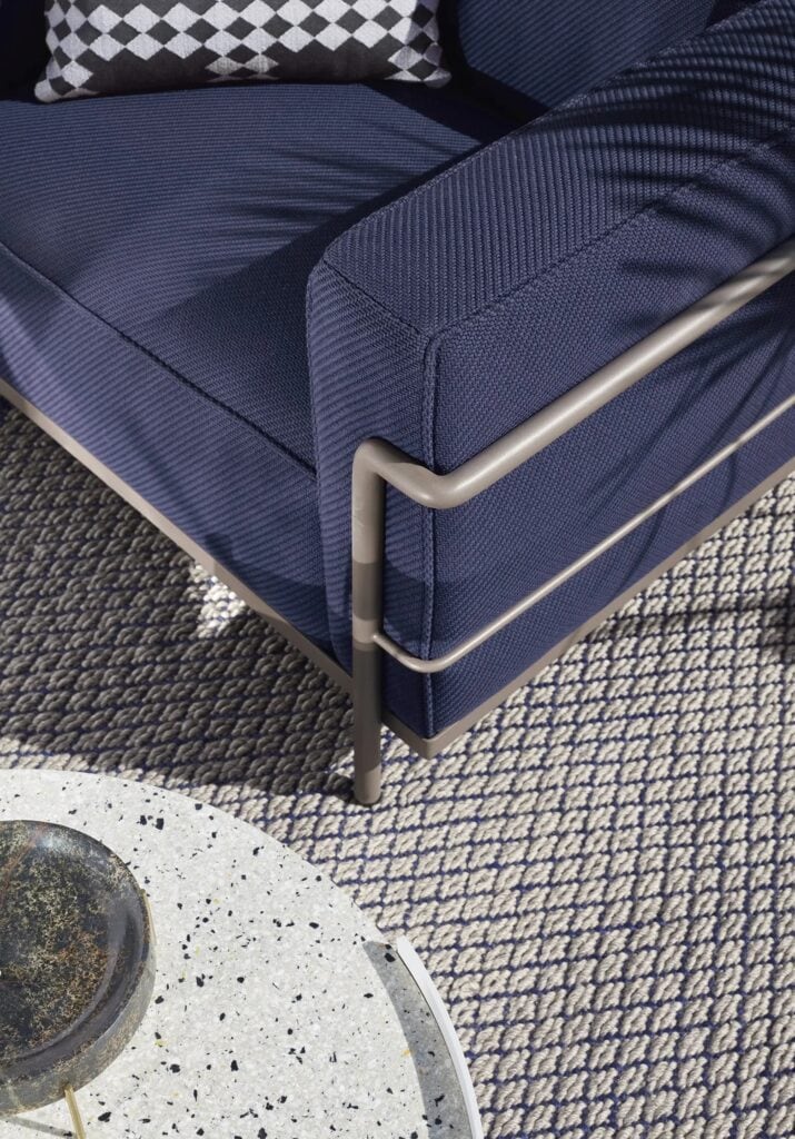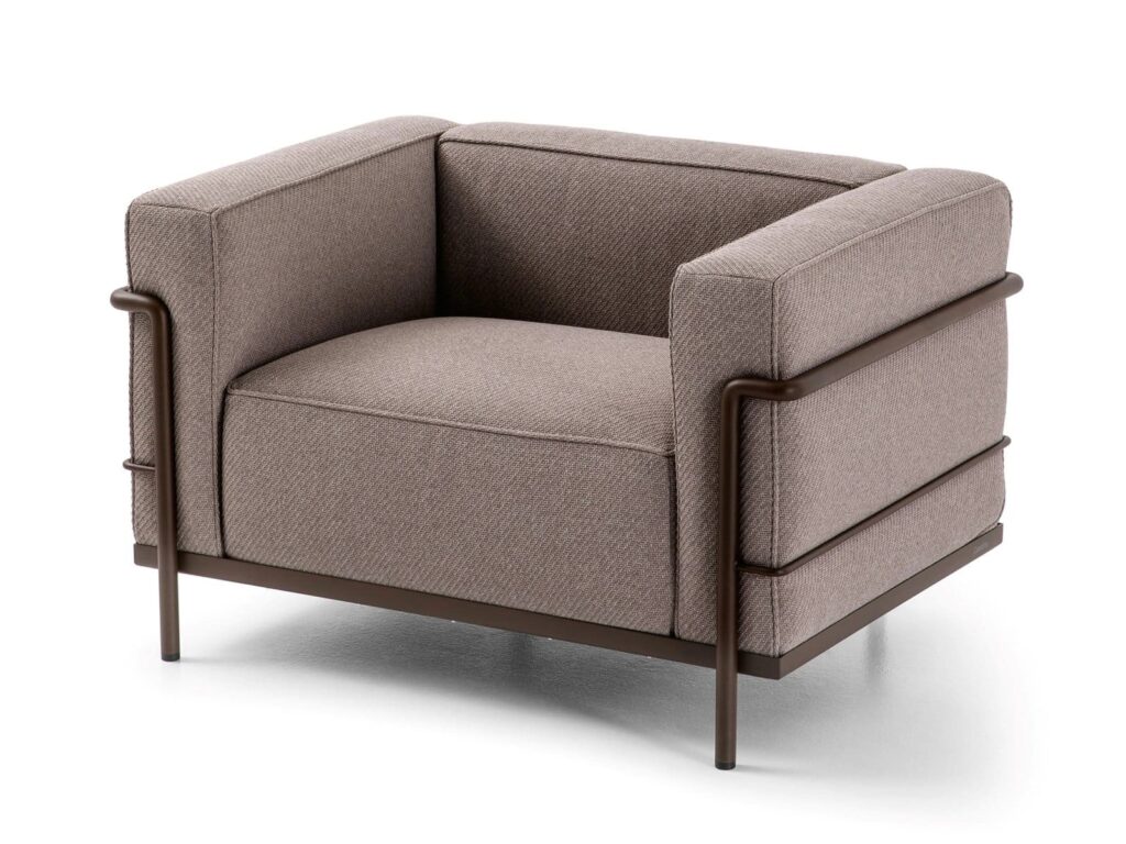 Die Kissen sind ohne Befestigung in einem Rahmen aus lackierten oder verchromten Stahlprofilen angeordnet, der das Hauptgestell dieses ikonischen Sessels in allen seinen Ausführungen bildet, vom Sessel mit einer oder zwei Armlehnen bis zu den Zweisitzer- oder Dreisitzersofas. Im Laufe der Jahre hat Cassina eng mit Charlotte Perriand, ihrer Tochter Pernette und der Fondation Le Corbusier zusammengearbeitet, um neue Versionen und Oberflächen einzuführen, die zwar eine Neuinterpretation des Originalentwurfs darstellen, dessen Authentizität aber in jeder Hinsicht respektieren. Darunter auch diese Outdoor-Varianten mit Gestell aus Edelstahl und einer speziellen Strukturlackierung in 5 Farben. Die Kissen haben einen Bezug aus einem wasserabweisenden Stoff, der für eine lange Lebensdauer und eine hohe Zuverlässigkeit bei jedem Wetter garantiert.