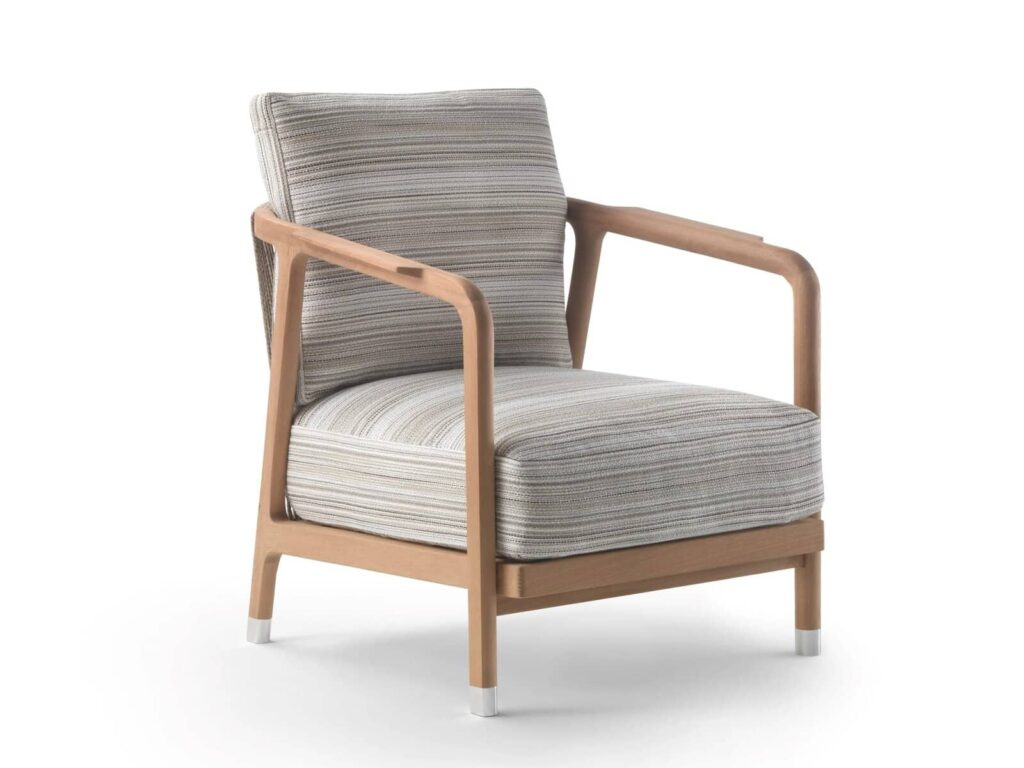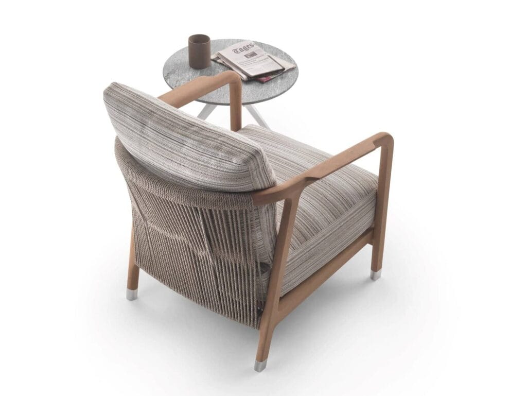 Das dichte Schnurgeflecht trifft auf das Massivholz mit warmem materischem Charakter: Das ist das Motiv, das die Inspiration für den Sessel Crono geliefert hat, der jetzt auch in der Outdoor-Version verfügbar ist. Die Verarbeitung des Gestells aus massivem Iroko-Holz ist ein deutliches Beispiel für die hohe Handwerkskunst, die typisch für die Produktion Flexform ist und sich auch in der Rückenlehne mit einer Bespannung zeigt, die von Hand mit einer Schnur ausgeführt wird. Die Familie Crono Outdoor umfasst einen Sessel und einen Armlehnstuhl für die Kombination mit einem Esstisch, die sich in zahlreichen Farbkombinationen ausführen lassen, da das Gestell aus Iroko-Holz in einer Reihe eleganter Oberflächen verfügbar ist und die Polypropylenschnur für die Bespannung in einer breiten Farbpalette erhältlich ist. Die Beine sind mit Füßen ausgestattet, die im Druckgussverfahren aus einer Metalllegierung hergestellt werden und über Nylongleiter verfügen. Wenn die Sitzmöbel Crono Outdoor für längere Zeit nicht verwendet werden, wird empfohlen, sie mit den entsprechenden Schutzhüllen abzudecken, damit sie sich ihren guten Zustand und ihr ursprüngliches Aussehen langfristig bewahren. Der Großteil der Teile, aus denen die Sitzmöbel Crono Outdoor bestehen, ist recycelbar.