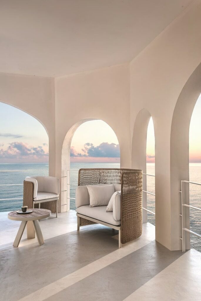 Die von Luca Nichetto entworfene Outdoor-Kollektion Esedra, der Star des neuen Ethimo-Katalogs, besticht durch ihre Ästhetik und ungewöhnliche Texturen. Zur Zeit der alten Römer war die "Exedra" ein halbkreisförmiger Raum, in dem gesellschaftliche Versammlungen und philosophische Debatten stattfanden. Die Kollektion Esedra lehnt sich an dieses Element der klassischen Architektur an, um ein komplettes Sortiment an Möbeln für einen zeitgenössischen Look im Freien zu schaffen. Dabei wird eine Beziehung zwischen den verschiedenen Materialien hergestellt, wie z. B. der Kunstfaser für die Rückenlehnen, die mit einer Technologie behandelt wird, die das Gefühl von gewebten Naturfasern vermittelt, der Stoffbezug der Kissen und die Aluminiumbeine.