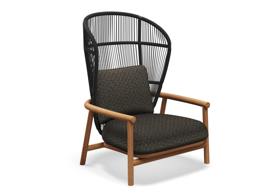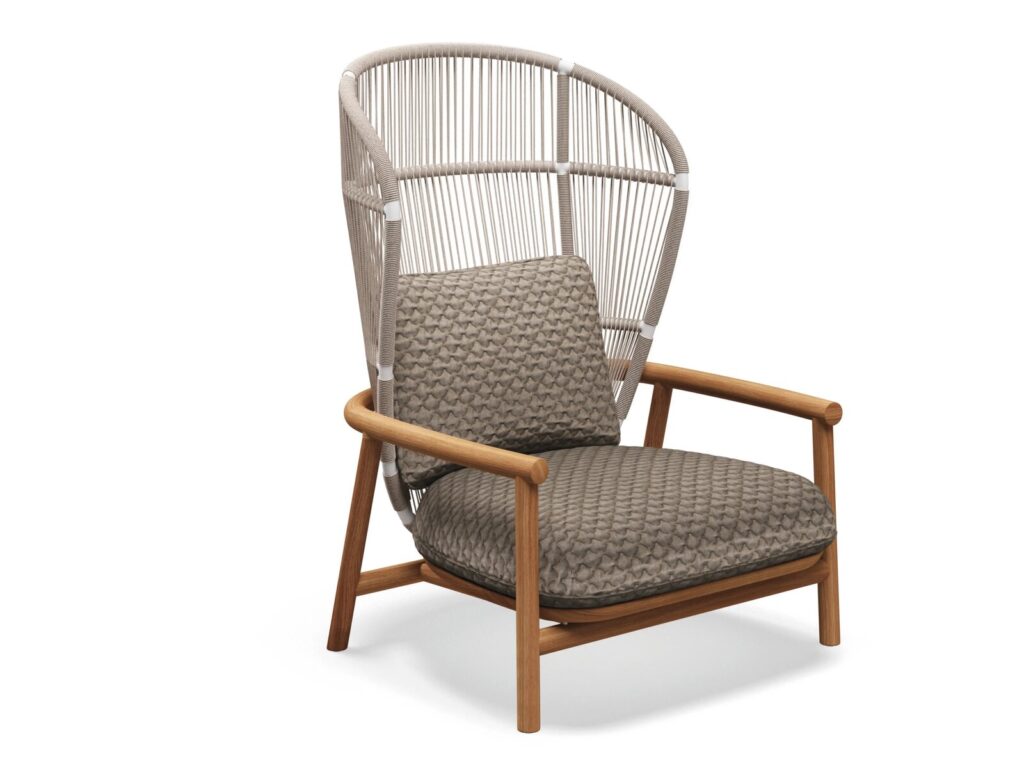 FERN - Hochlehniger Gartensessel aus Stoff und Seil mit Armlehnen.