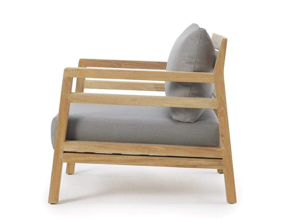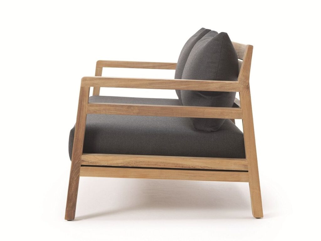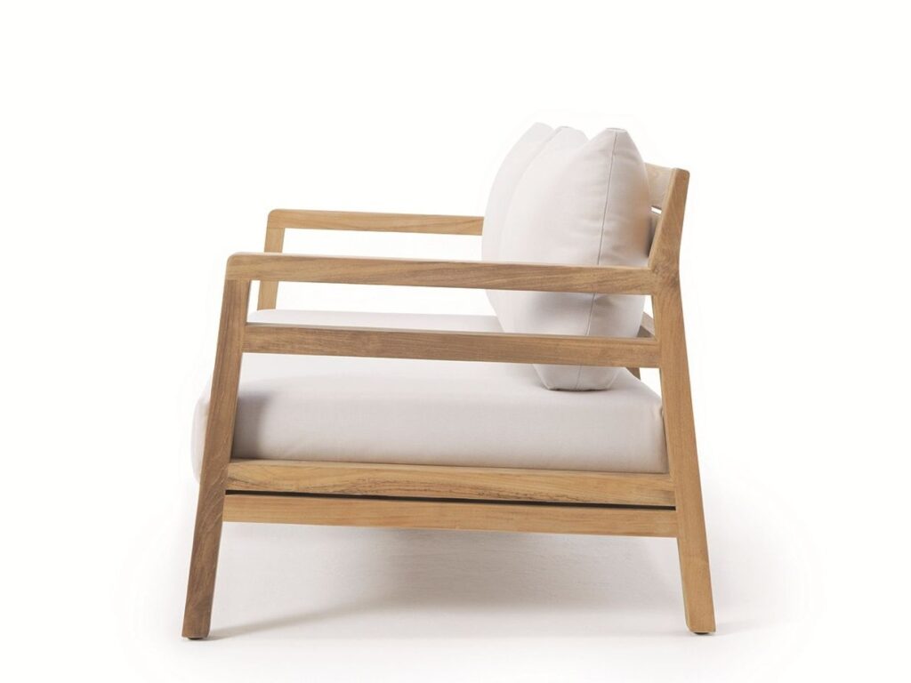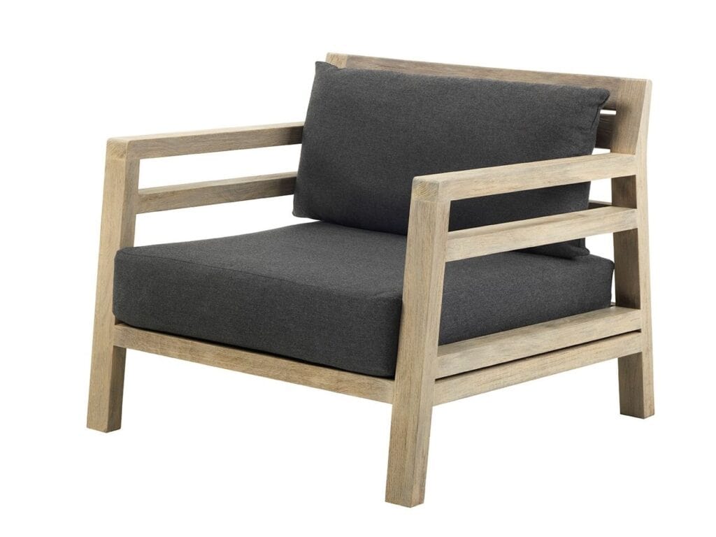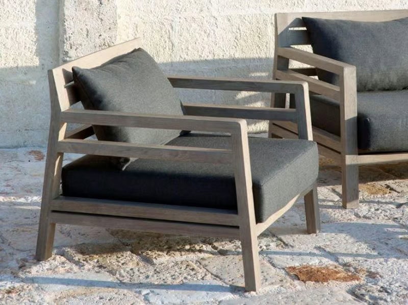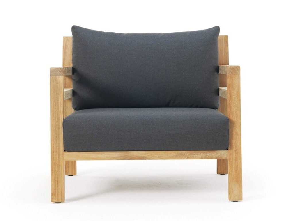 Sessel aus gebeiztem Teakholz oder lackiertes Mahagoni, 80x80 cm, komplett mit Sitz- und Rückenlehnenkissen.